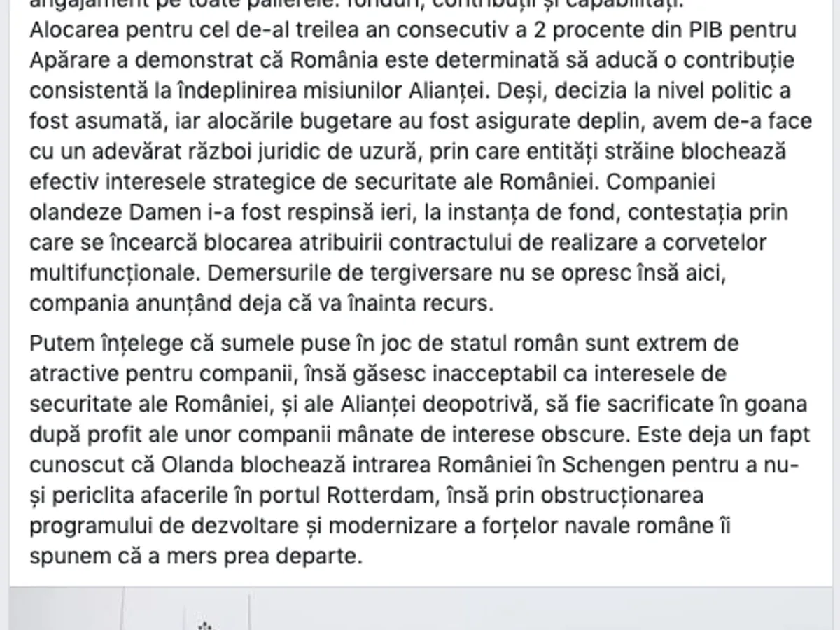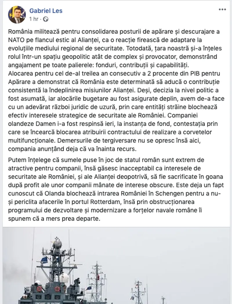 Procesul intentat de compania olandeză Ministerului Apărării, deși pierdut în primă instanță de Damen, blochează atribuirea licitației de construire de corvete. Ministrul Gabriel Leș a postat un comentariu dur la adresa olandezilor, acuzându-i de sabotaj.