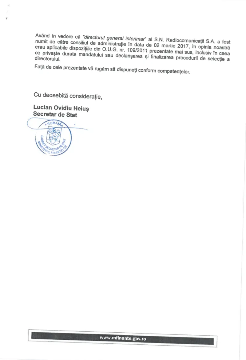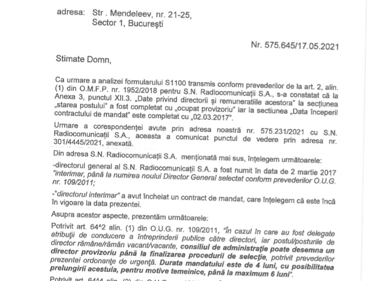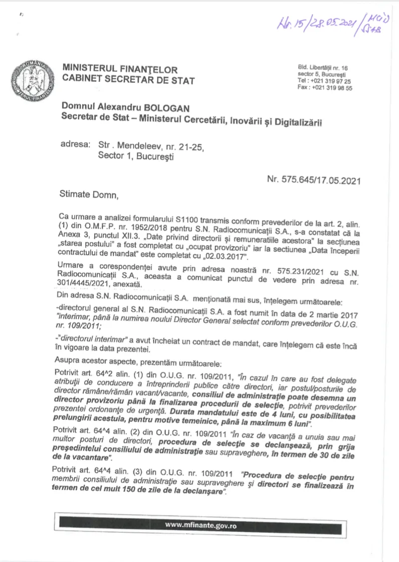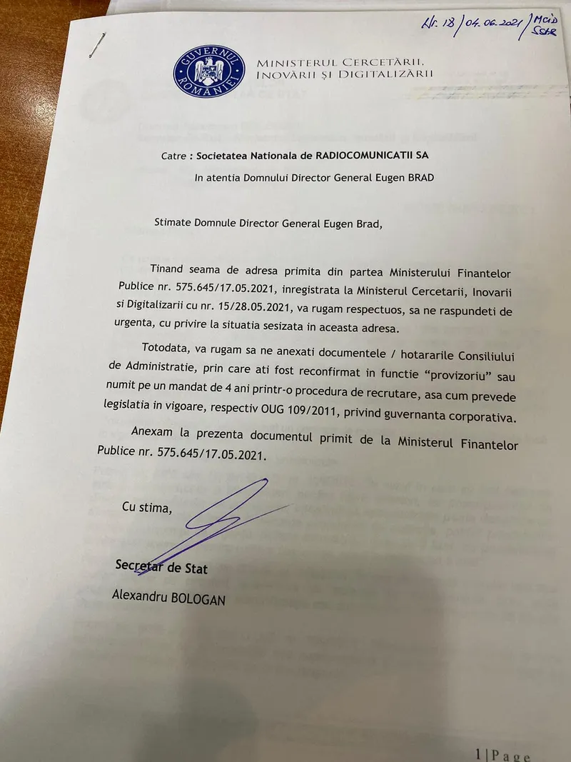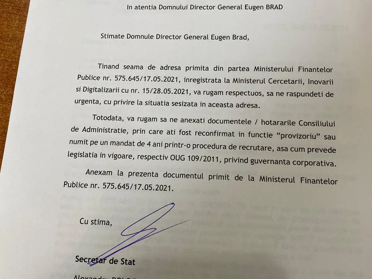 Ministrul Digitalizării, însă, după 17 zile de la primirea adresei de la Finanțe abia a catadicsit să trimită o adresă la Radiocom prin care a cerut documentele care l-ar îndreptăți pe Eugen Brad să fie încă director.