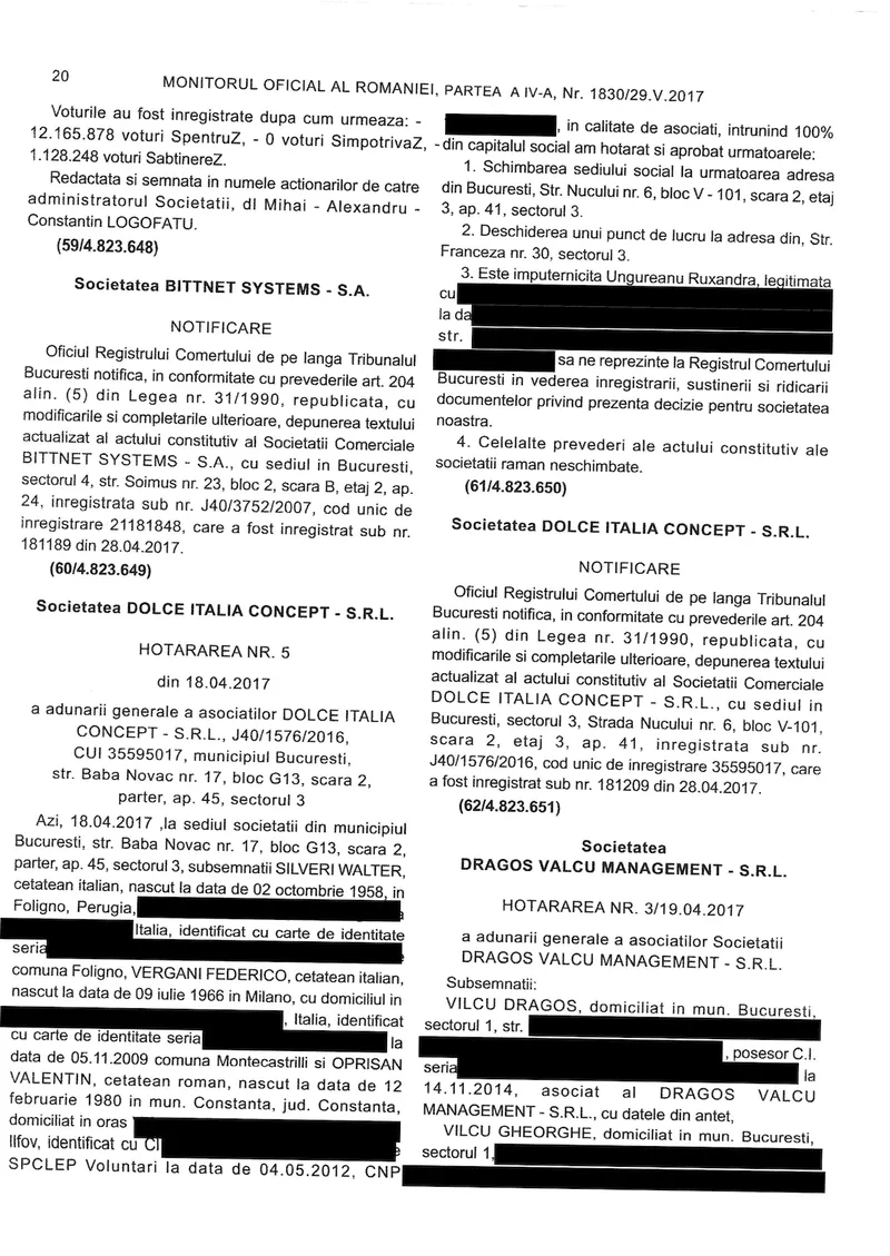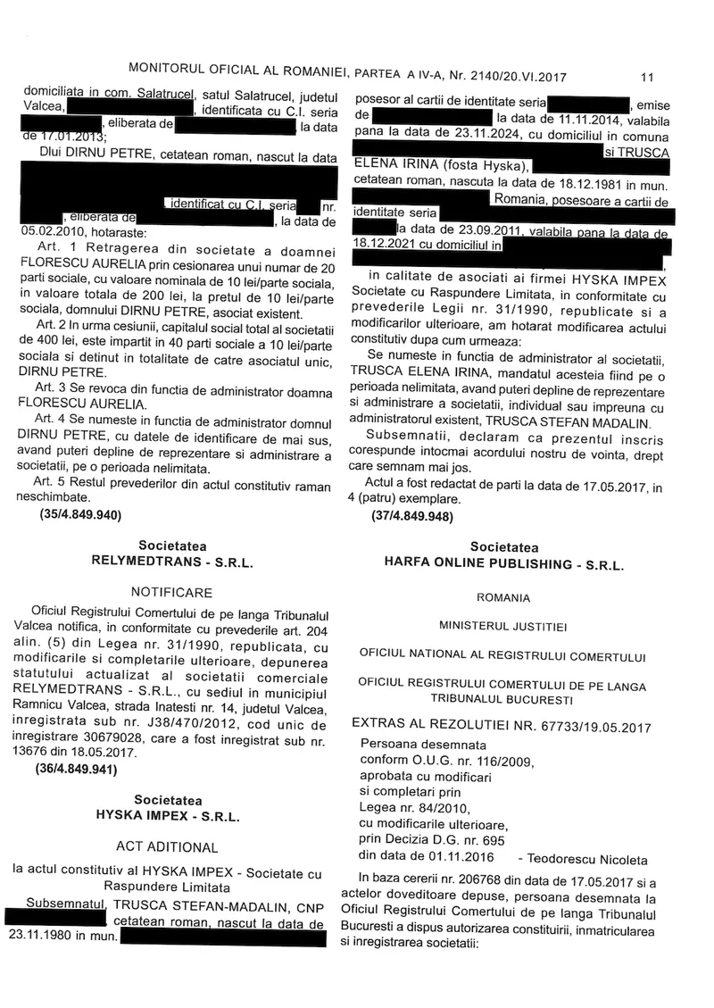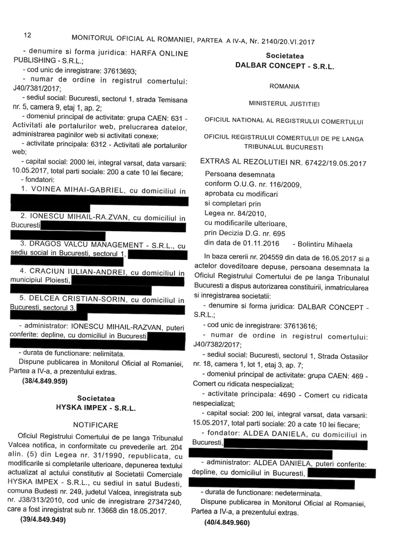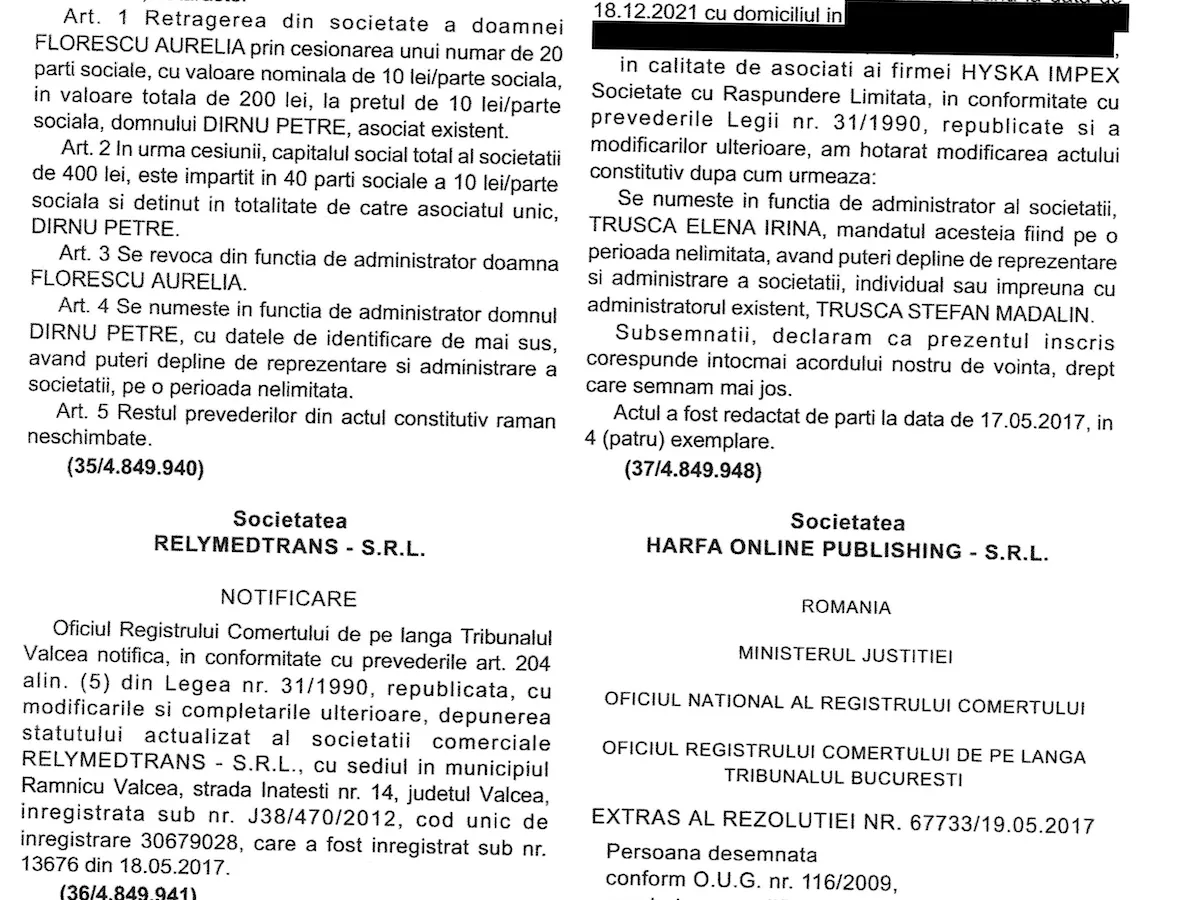 La nici două luni de la înființarea firmei Harfa Online Publishing SRL, compania deținută de Vîlcu junior și Vîlcu senior decide să se retragă din acționariat, vânzându-și pachetul către ceilalți asociați.