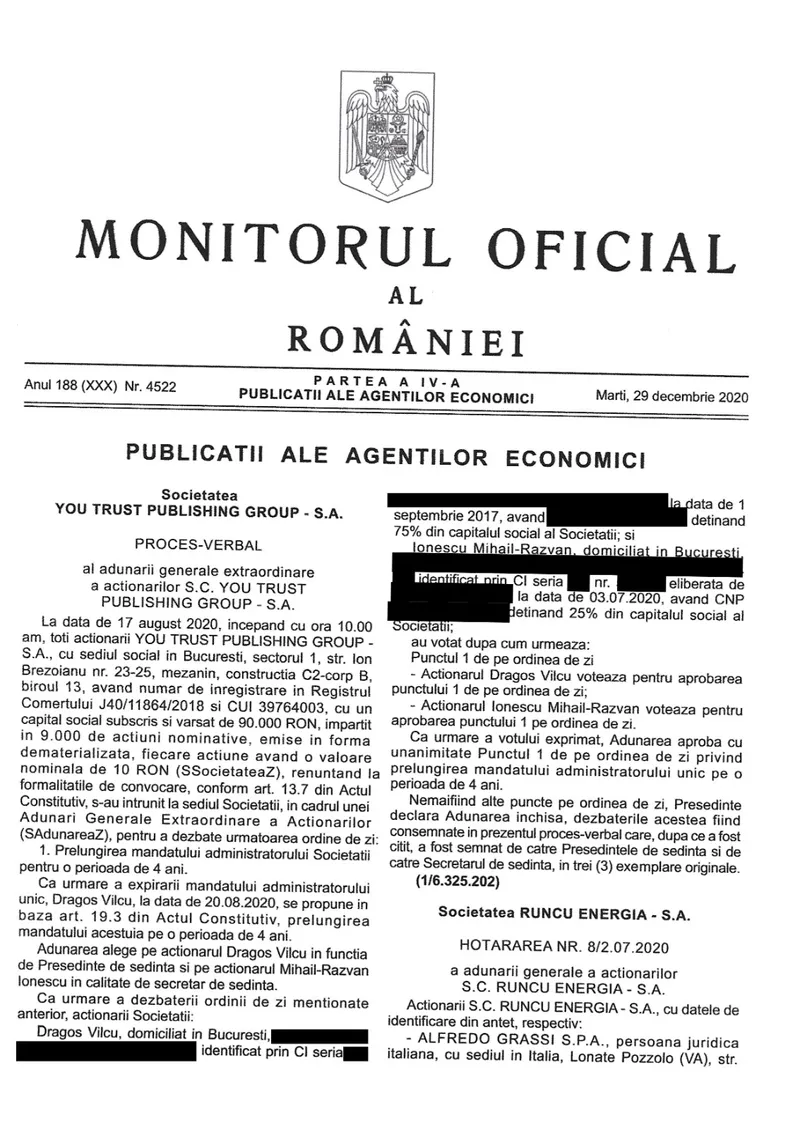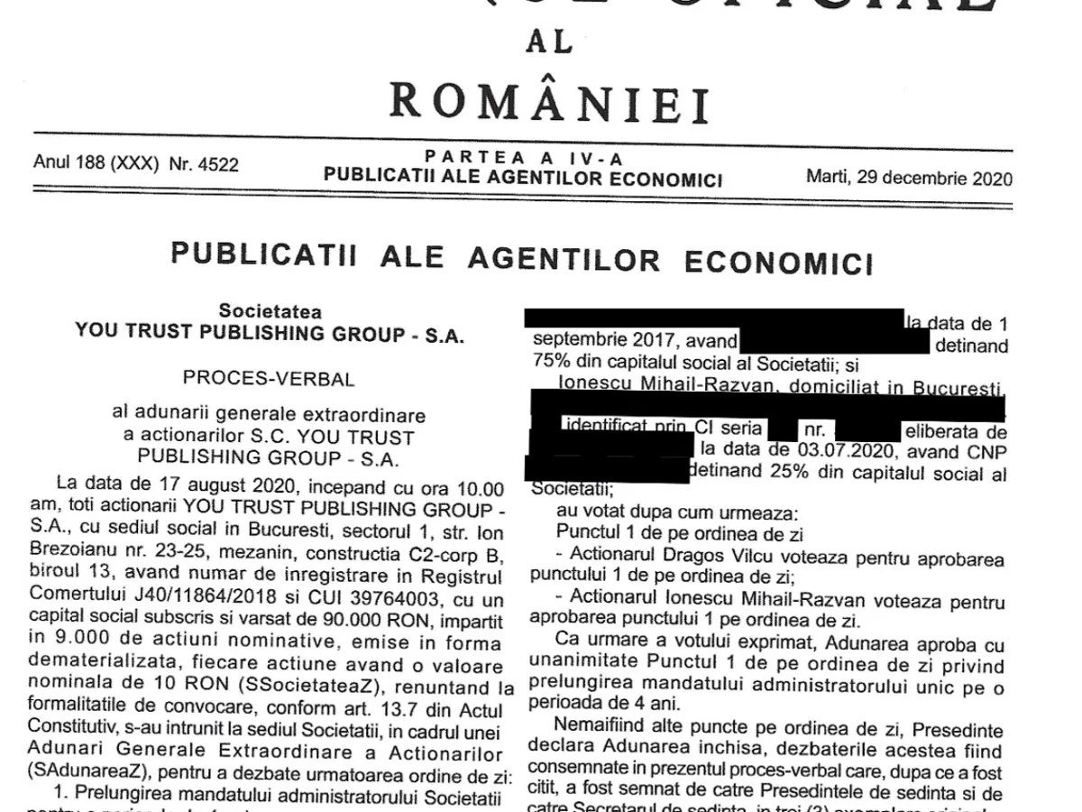 O altă firmă controlată de Vîlcu junior este You Trust Publishing Group SA, unde el are 95%, restul acțiunilor fiind deținut de același Răzvan Ionescu. Deși înființată în 2018, firma nu avusese nicio activitate până la sfârșitul lui 2021. Când a început brusc o campanie de cumpărare a unor SRL-uri înființate de jurnaliști.