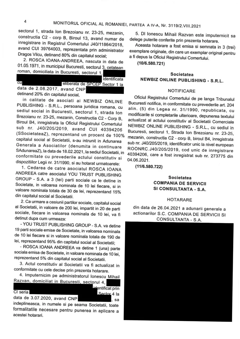 O altă afacere controlată de Vîlcu junior, prin You Trust Publishing SA, este Newbiz Online Publishing SRL, administrată de același Răzvan Ionescu. Înființată în 2019, firma o avea ca acționar minoritar, cu 20%, pe Andreea Roșca, fost redactor șef al revistei Capital. Doi ani mai târziu, în august 2021, ea rămâne doar cu 5%.