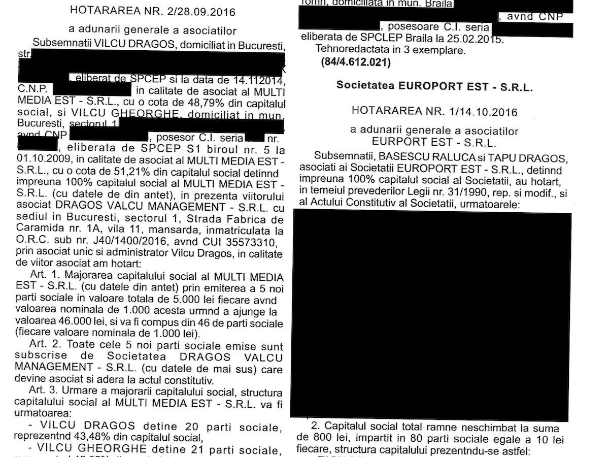 Aproape jumătate din acțiuni, mai precis 49,5%, erau deținute de Dragoș Vîlcu Management SRL. La rândul său, această firmă era deținută de producătorul de filme cu același nume și de tatăl lui, Gheorghe Vîlcu, fost ambasador al României, astăzi pensionar.