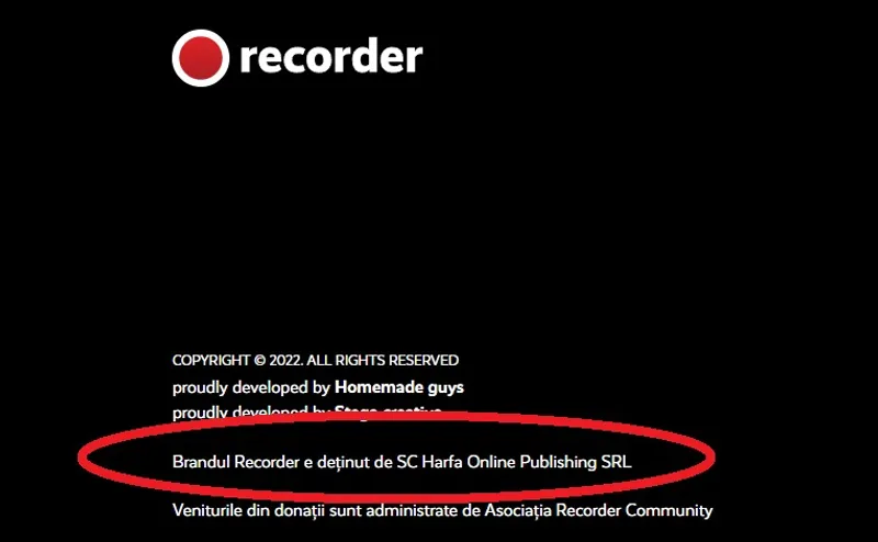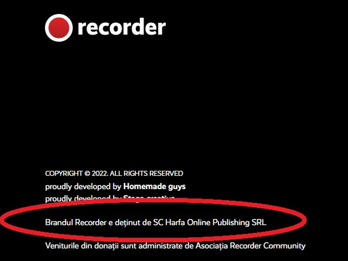 În realitate, după cum scrie într-un colț mic al secțiunii “Despre noi”, brandul Recorder este deținut de o firmă obscură cu denumire bizară – Harfa Online Publishing SRL. Firma, care asigură și editarea publicației, adică administrează întreaga afacere, a fost înființată în 2017.