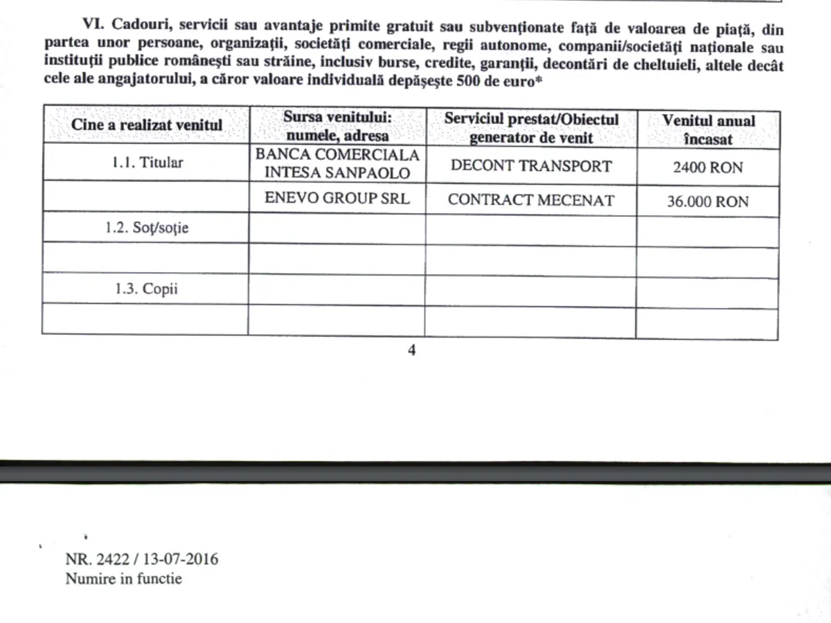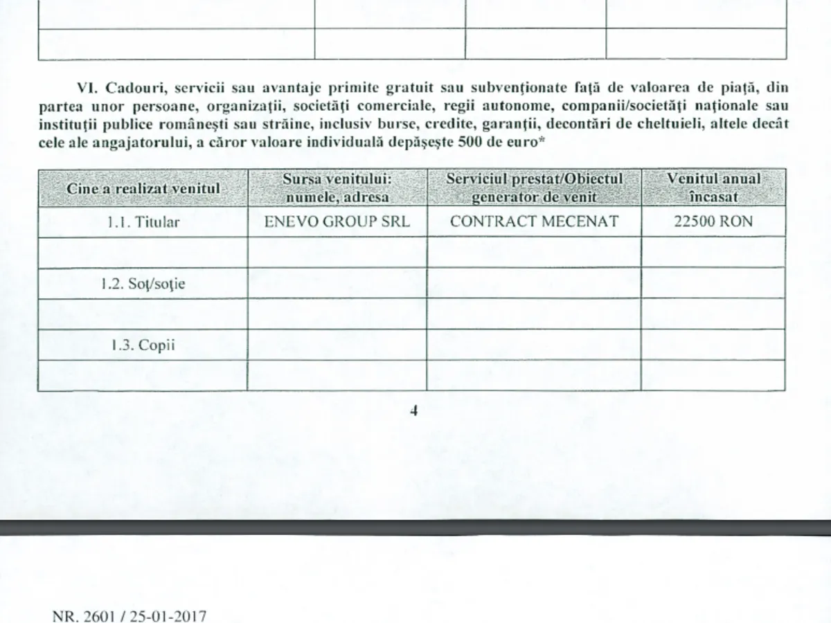 Prima: se pomenește o "angajare" la Enevo Group pentru care s-a primit "salariu", dar declarațiile de avere nu pomenesc nici un salariu de la Enevo Group.
