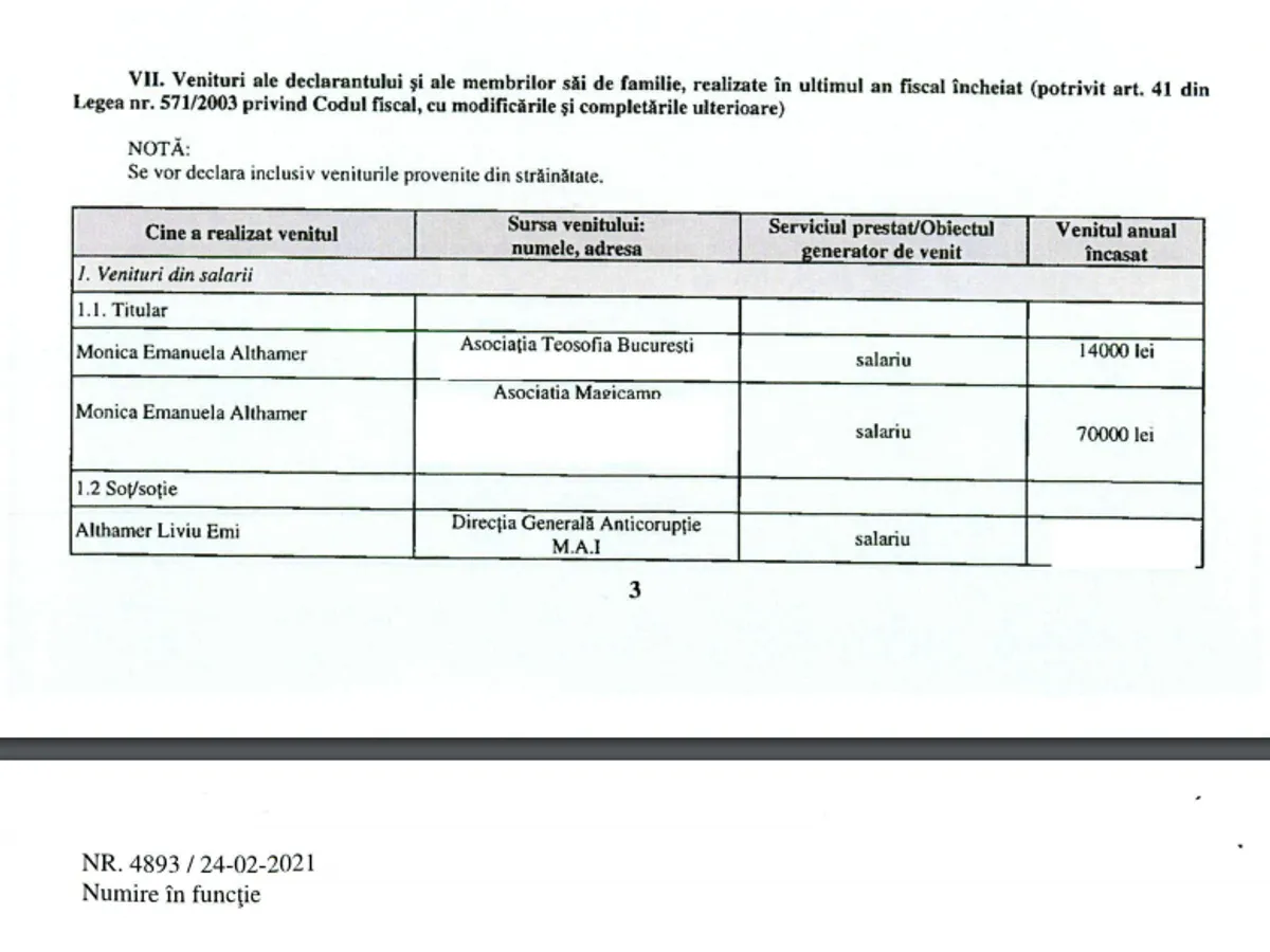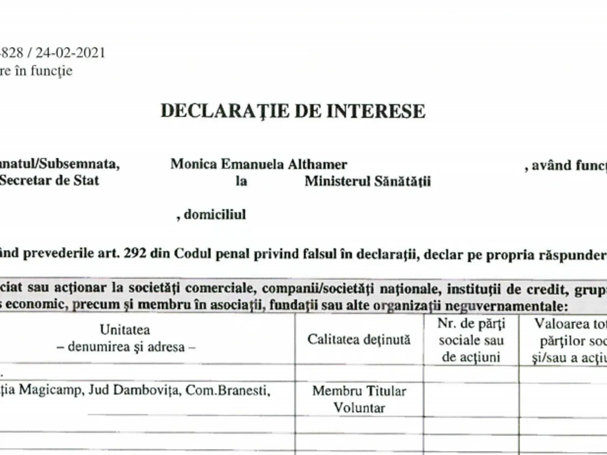 Și declarațiile de avere din primul mandat de secretar de stat la Ministerul Sănătății al Monicăi Althamer sunt relevante. În cea depusă la intrarea în mandat, în 2016, aceasta a menționat 36.000 de lei primiți prin "contract de mecenat" de la o companie privată în 2015.