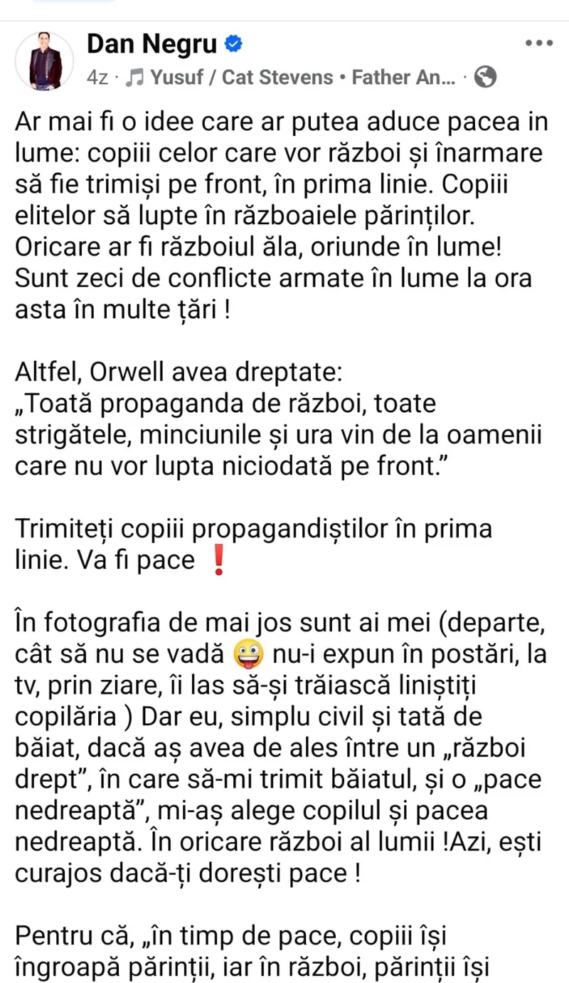 În fotografia de mai jos sunt ai mei (departe, cât să nu se vadă 🤪 nu-i expun în postări, la tv, prin ziare, îi las să-și trăiască liniștiți copilăria). Dar eu, simplu civil și tată de băiat, dacă aș avea de ales între un „război drept”, în care să-mi trimit băiatul, și o „pace nedreaptă”, mi-aș alege copilul și pacea nedreaptă. În oricare război al lumii! Azi, ești curajos dacă-ți dorești pace!