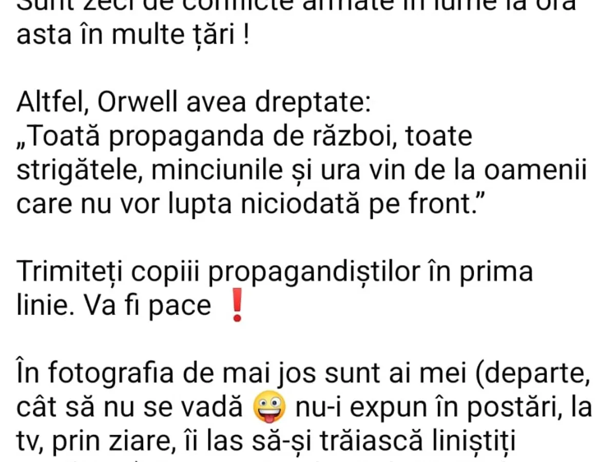 “Ar mai fi o idee care ar putea aduce pacea în lume: copiii celor care vor război și înarmare să fie trimiși pe front, în prima linie. Copiii elitelor să lupte în războaiele părinților. Oricare ar fi războiul ăla, oriunde în lume! Sunt zeci de conflicte armate în lume la ora asta în multe țări!