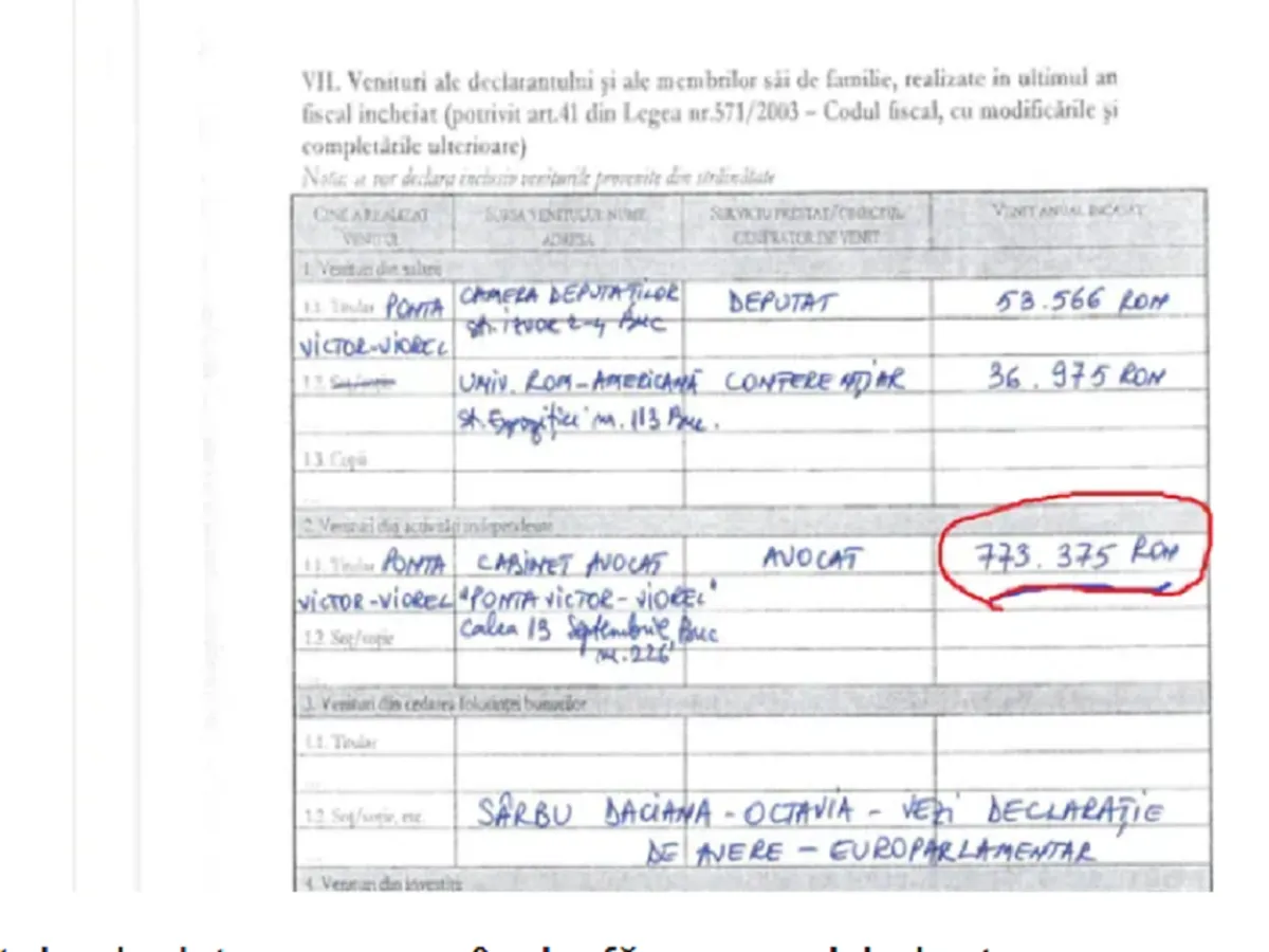 Ponta a rămas cu cei peste 1.600.000 lei câștigați din avocatură. La care se adaugă sumele de bani câștigate ca profesor la Universitatea Româno-Americană.