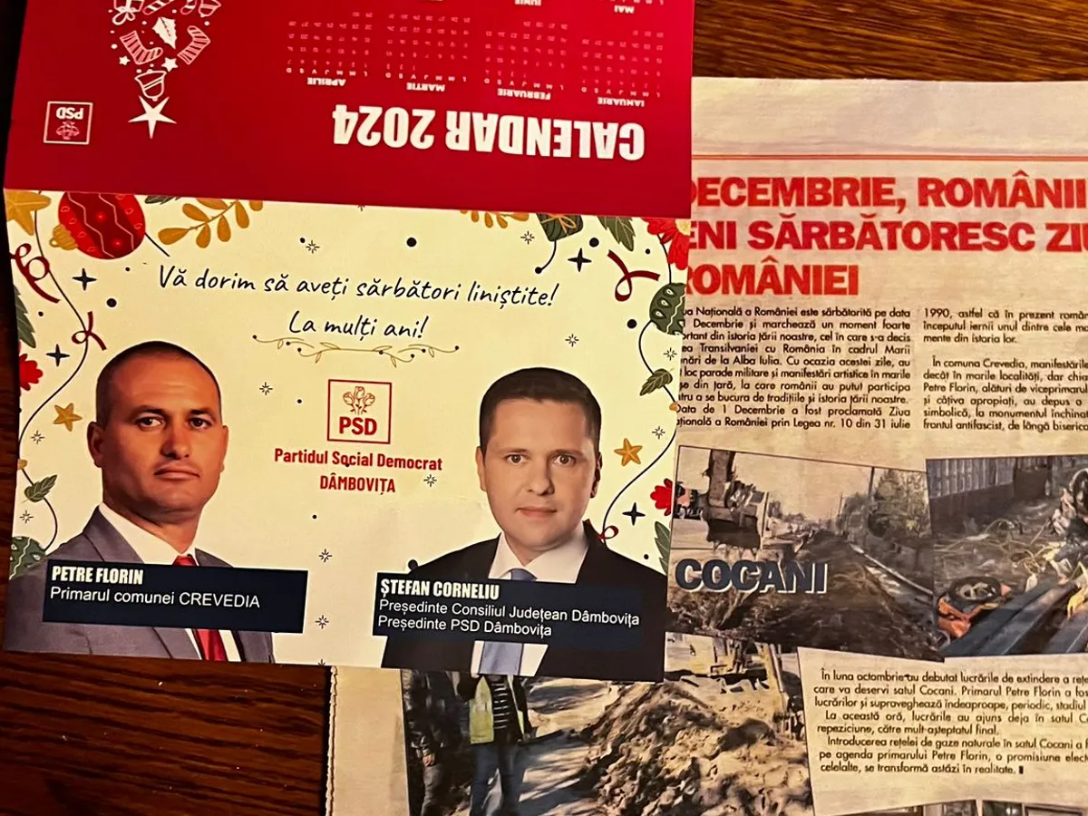 Pliantele au fost distribuite în aceste zile. Așa cum se vede din imaginea de mai jos, în Crevedia au fost distribuite și calendare cu primarul Florin Petre și cu președintele PSD Dâmbovița.