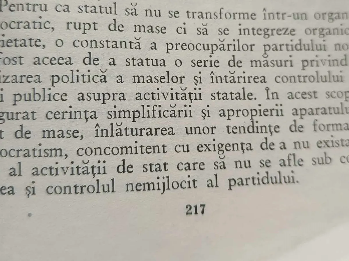 Mistificarea realității prinde viteză: „o constantă a Partidului Comunist a fost aceea de a statua o seri de măsuri privind activitatea politică a maselor și întărirea controlului opiniei publice asupra activității statale”. Când, realitatea era exact inversă.