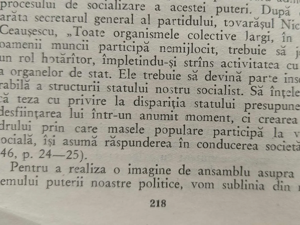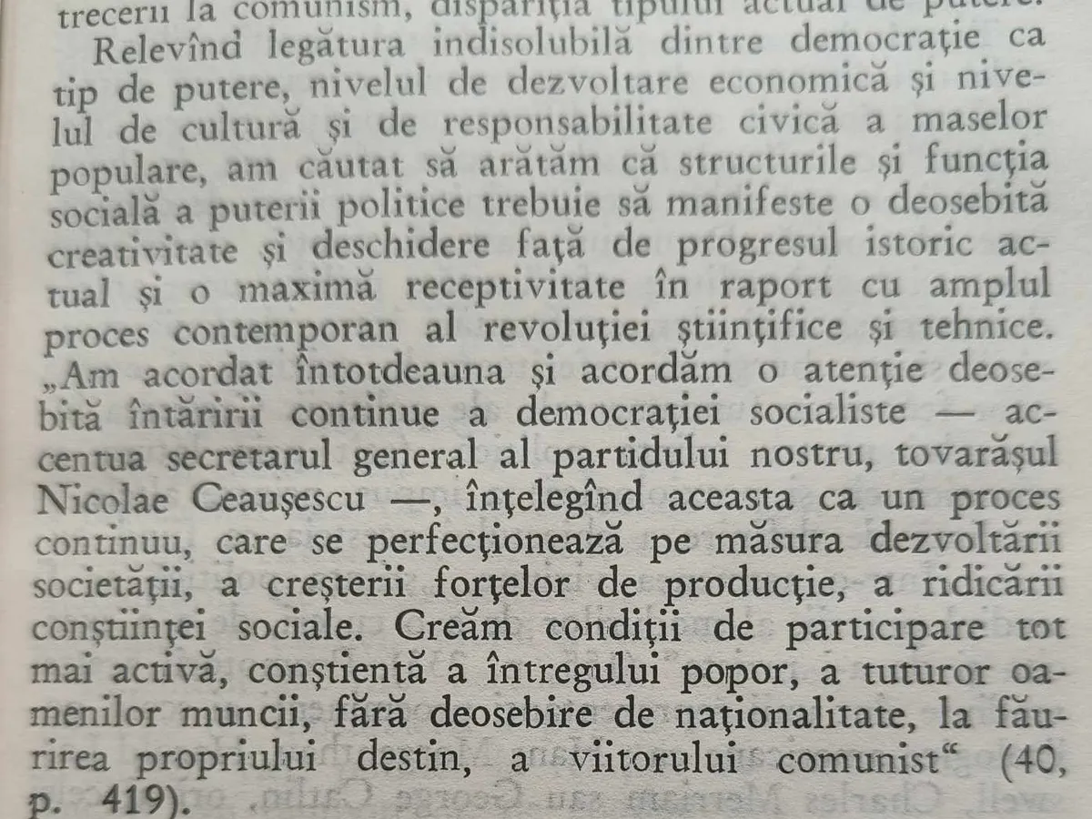 „Am acordat și acordăm mereu o atenție sporită întăririi continue a democrației socialiste - accentua secretarul general al partidului nostru, tovarășul Nicolae Ceaușescu - înțelegând aceasta ca un proces continuu, care se perfecționeză pe măsura dezvoltării societății, a creșterii forțelor de producție, a ridicării conștiinței sociale”, scrie Măgureanu.