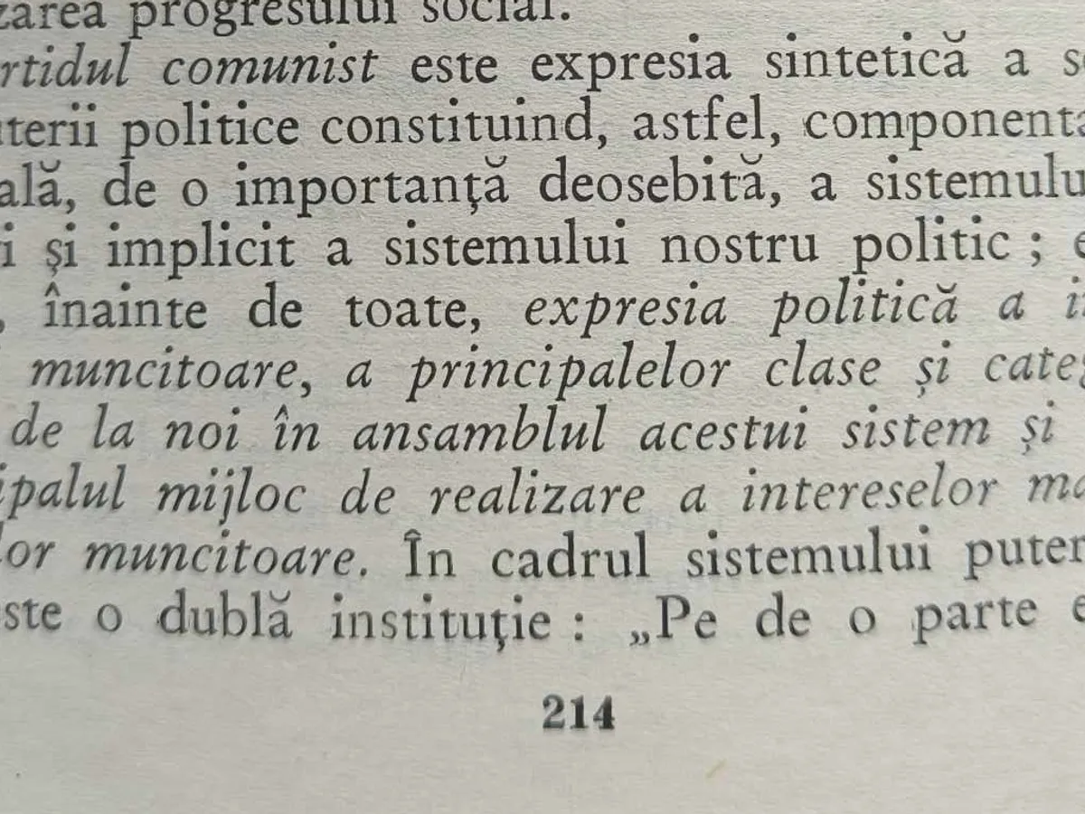 Către final autorul are o revelație și scrie cu litere înclinate, ca o iluminare: Partidul Comunist este expresia politică a integrării clasei muncitoare, a principalelor clase și categorii sociale în ansamblul acestui sistem și totodată principalul mijloc de realizare a intereselor majore ale maselor muncitoare.