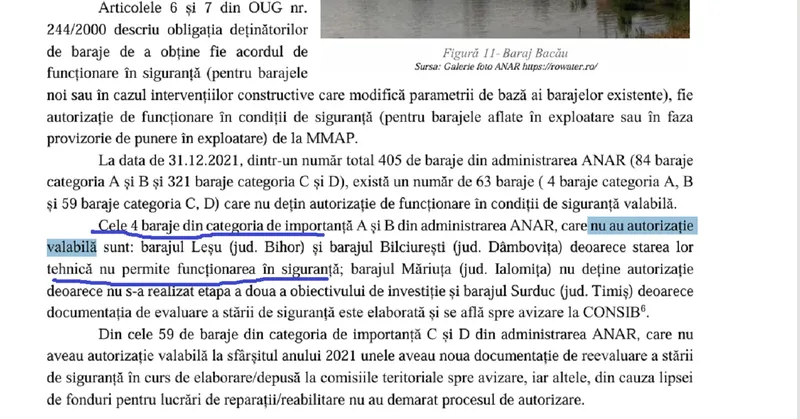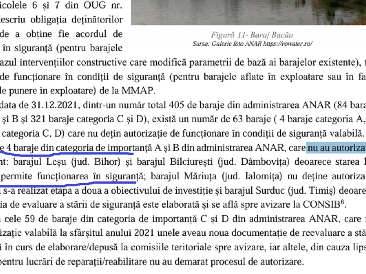 Potrivit documentului la care facem referire, „există un număr de 63 baraje ( 4 baraje categoria A, B și 59 baraje categoria C, D) care nu dețin autorizație de funcționare în condiții de siguranță valabilă”.