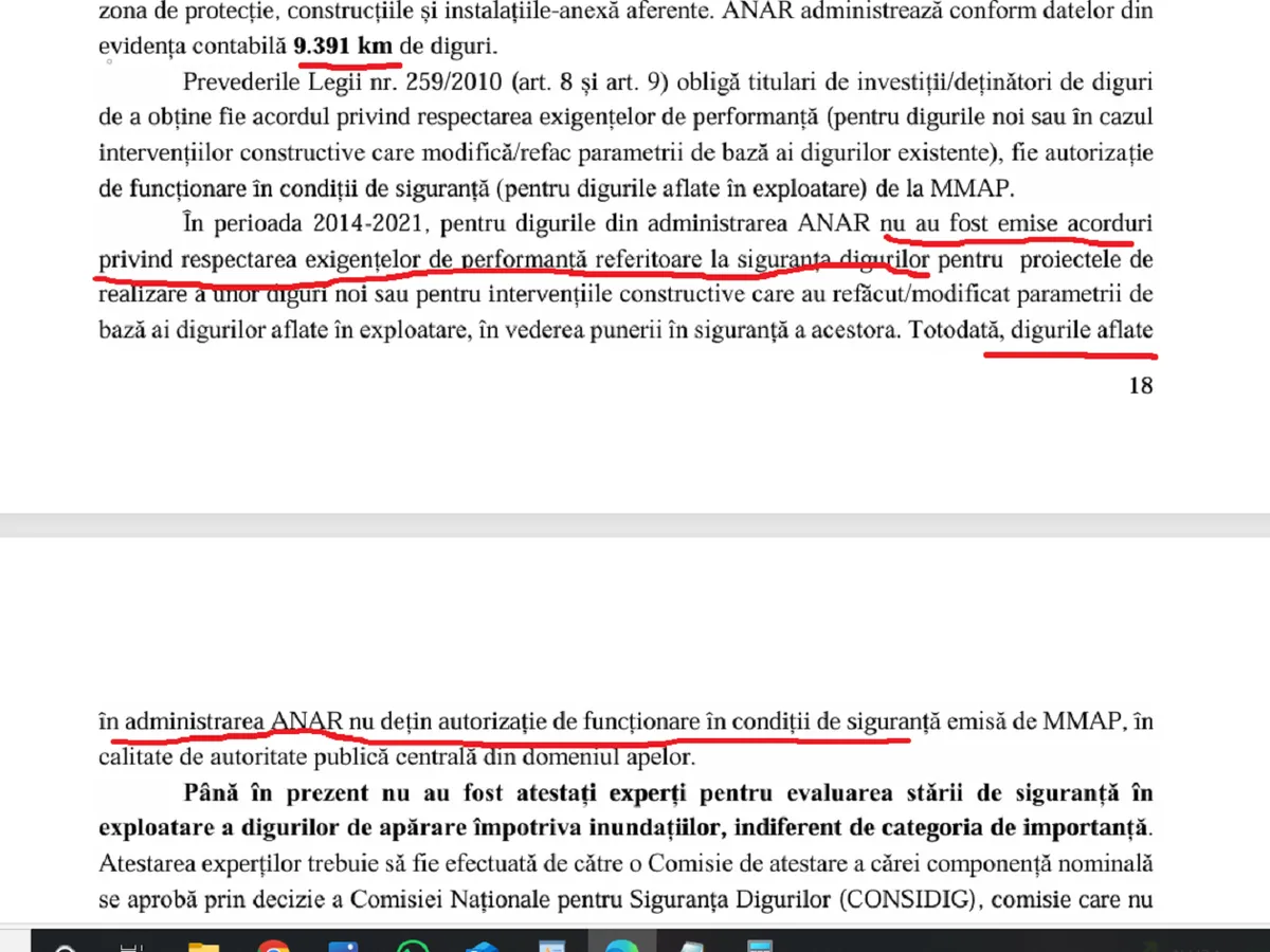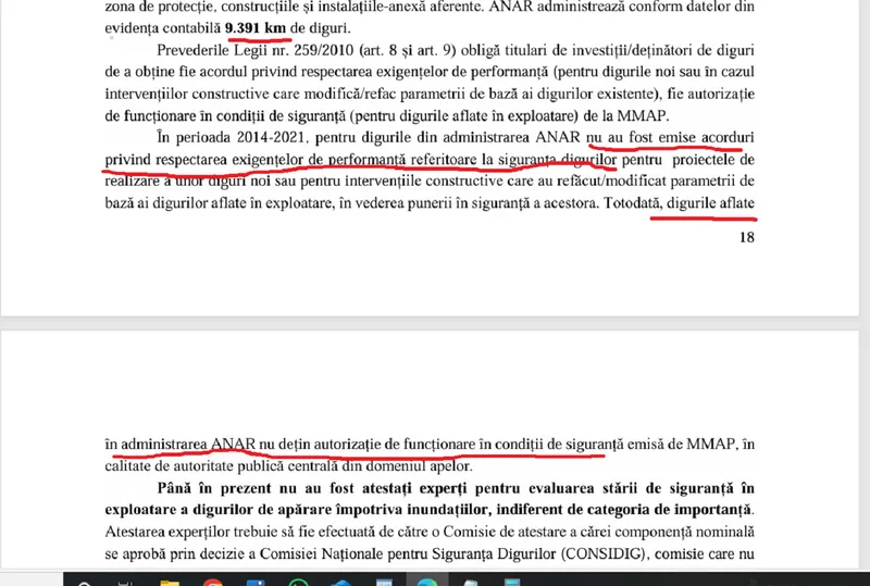 Totodată, digurile aflate în administrarea ANAR nu dețin autorizație de funcționare în condiții de siguranță emisă de MMAP, în calitate de autoritate publică centrală din domeniul apelor”, arată raportul Curții de Consturi consultat de Newsweek România.