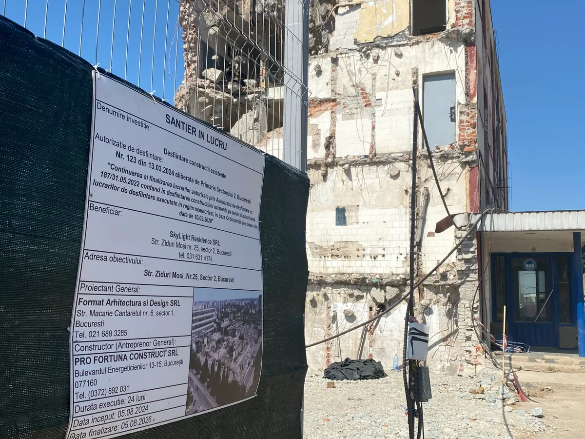 Conform autorizației de demolare, afișată chiar la intrare, lucrările sunt pentru „desființarea construcției existente nr. 123 din 13.03. 2024, eliberată de Primăria Sectorului 2. Continuarea și finalizarea lucrărilor autorizate prin Autorizația de Desființare nr. 137/31.05.2022, constând în desființarea construcțiilor existente pe teren și autorizarea lucrărilor de desființare executate în regim neautorizat în baza ordonanței de clasare din data de 10.02.2020.”