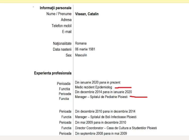 Vișean are 42 de ani, dar este încă medic rezident. Își face rezidențiatul la Spitalul Sfântul Ioan din București. El a terminat facultatea de medicină în anul 1999, dar nu a profesat. CV AICI
