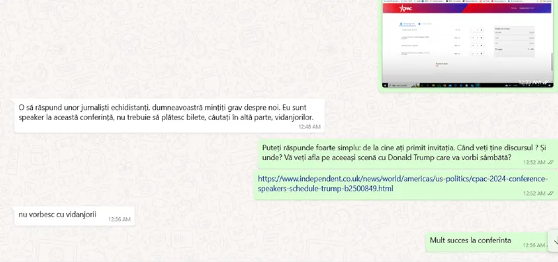 L-am întrebat pe George Simion dacă a plătit un bilet pentru a ajunge la conferință. După ce ne-a catalogat „mincinoși” și „vidanjori”, Simion a pretins că este invitat și speaker. L-am întrebat cine l-a invitat și când va vorbi, dar Simion s-a retras din discuție cu o nouă înjurătură.