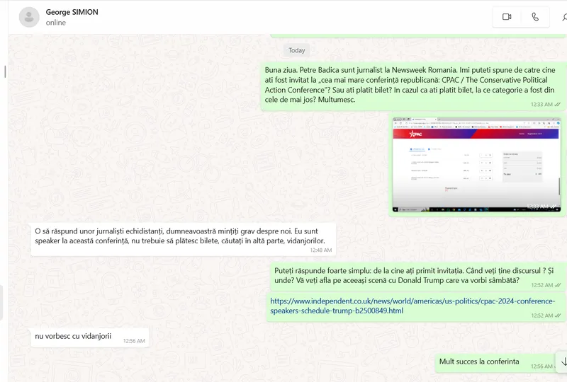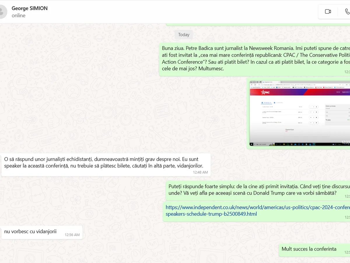 Newsweek: Buna ziua. Petre Badică sunt, jurnalist la Newsweek Romania. Îmi puteți spune de către cine ați fost invitat la „cea mai mare conferință republicană: CPAC / The Conservative Political Action Conference”? Sau ați plătit bilet? În cazul în care ați plătit bilet, la ce categorie a fost? Mulțumesc.