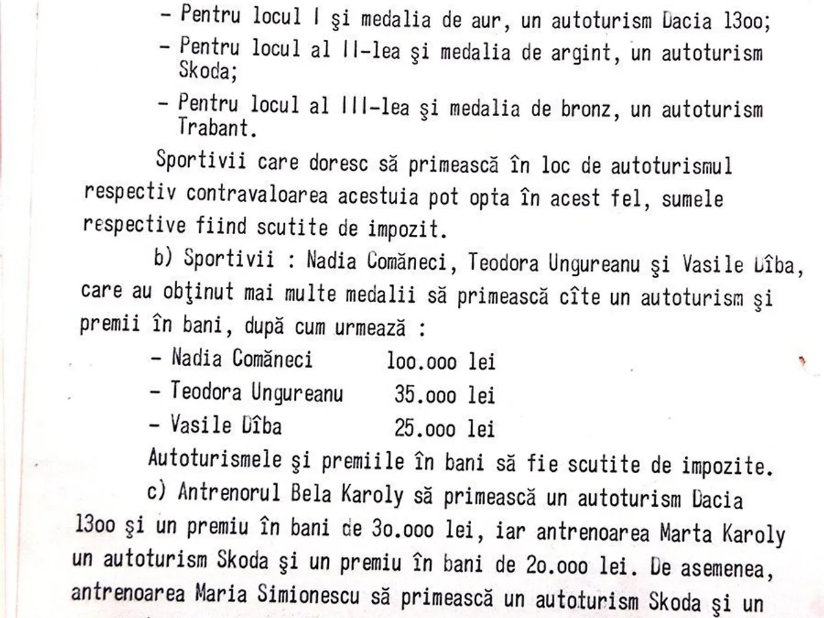 Documente de Arhivă arată că Nadia a primit 100.000 de lei, iar antrenorii Bela și Marta Karolyi o sumă de bani și o mașină. Decizia finală i-a aparținut lui Nicolae Ceaușescu.