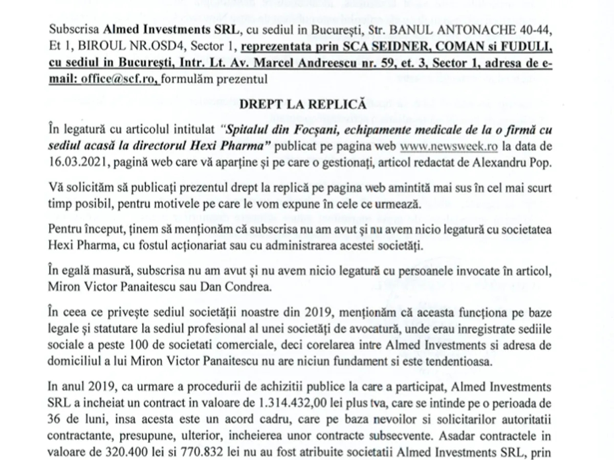 Pe 29 martie 2021, Newsweek România a primit un drept la replică (integral, mai jos), la aproape un an de la publicarea acestui articol (16 martie 2020).