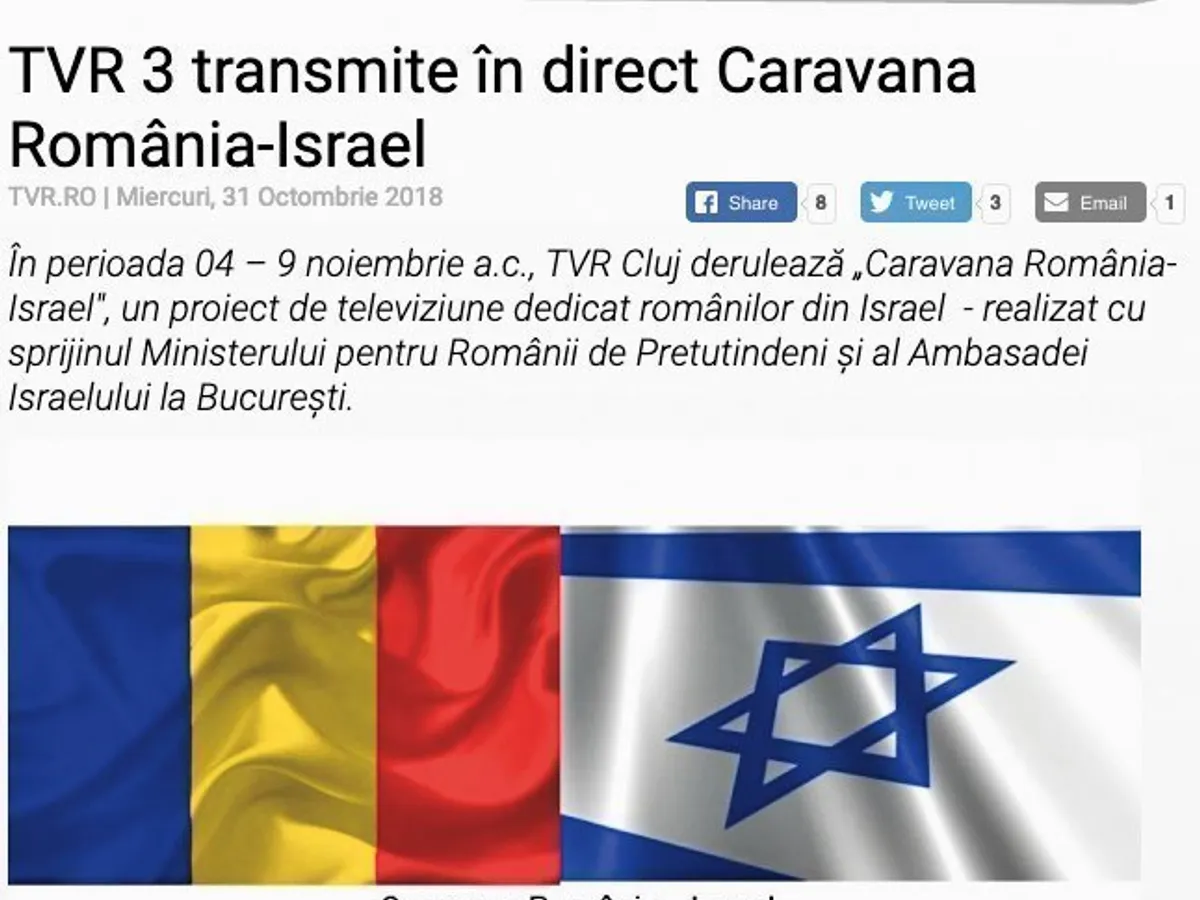 17 persoane în Israel. Deplasarea urma să se facă în perioada 1-11 noiembrie 2018. Motivul? Realizarea unor filmări și câteva transmisii în direct pentru emisiunile „Regiunea în Obiectiv“, „Stația România - Israel“ și „Cântec și Poveste“ difuzate pe TVR Cluj, TVR3 și TVR Interanțional, în Jurnalele de Ştiri ale TVR1, TVR2 şi TVR3, precum și intervenții în direct în cadrul emisiunii „Observator Transilvan“. Toate producțiile au fost reunite sub titulatura „Caravana România - Israel“. În plus, se mai dorea prezentarea a două proiecte la sediul Institutului Cultural Român din Tel Aviv: o emisiune despre viața comunităților de evrei și prezentarea volumului „Auschwitz Alive“.