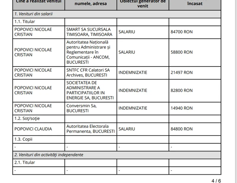 Popovici Nicolae Cristian consemnează cinci surse de venit în Declarația sa de avere depusă anul acesta pentru 2022. Toate din bani publici.