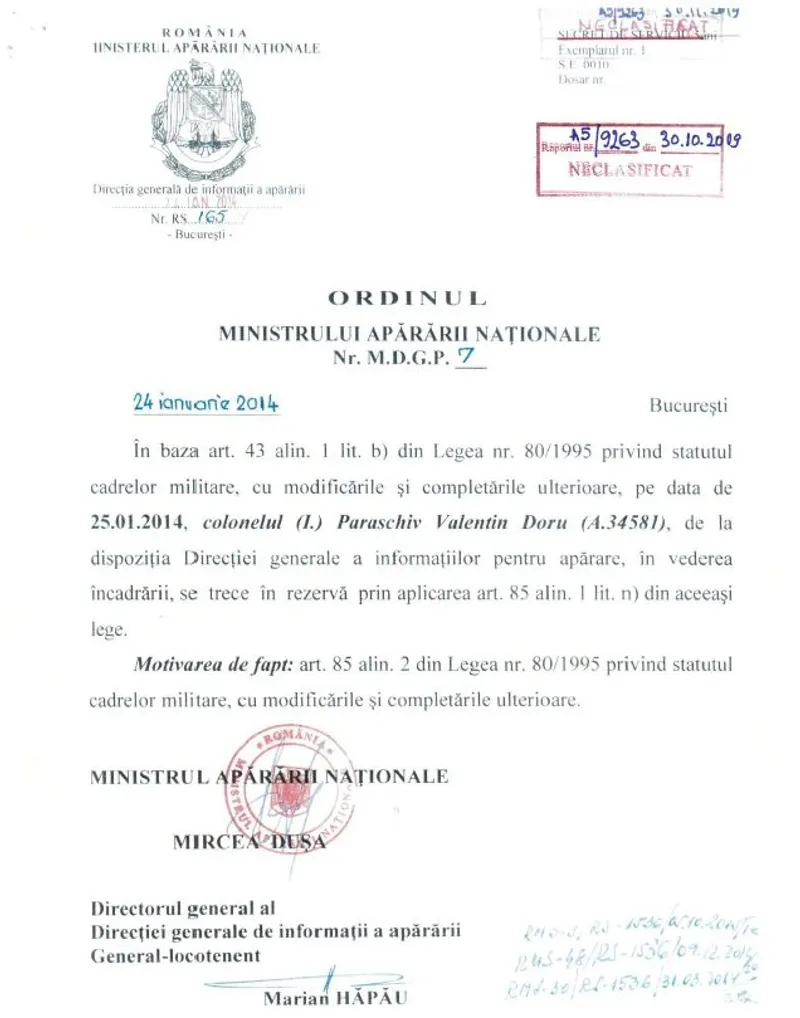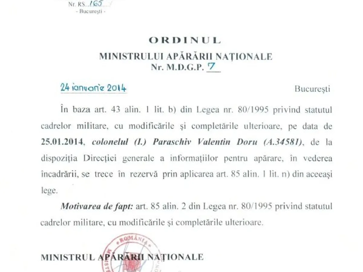 Povestea pe scurt: În baza ordinului ministrului Apărării Naționale MDGP nr. 7 din 24 ianuarie 2014, col. Doru Paraschiv a fost dat afară din Direcția de Contrainformații și Securitate Militară (DCiSM), sub acuzația de ”facilitarea scurgerii de informații clasificate”, care nici măcar nu este prevăzută în legislația de profil.