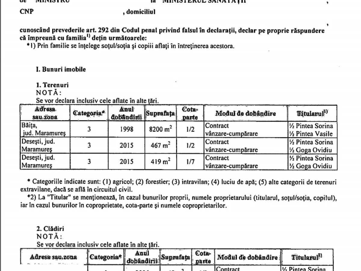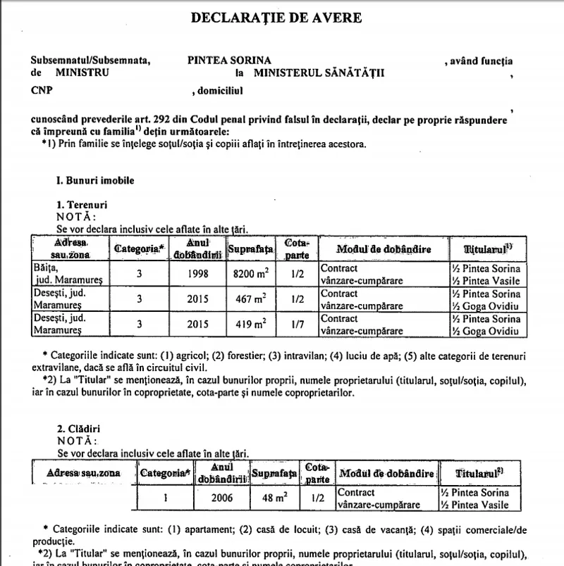 În declarația de avere, Sorina Pintea nu menționează, la capitolul "clădiri" în proprietate, decât un apartament în Baia Mare de 48 mp. De fapt, fostul ministru al Sănătății își petrece(a) mult timp pe domeniul de peste 8.000 mp de la Tăuții Măgherăuș, unde are o vilă enormă.