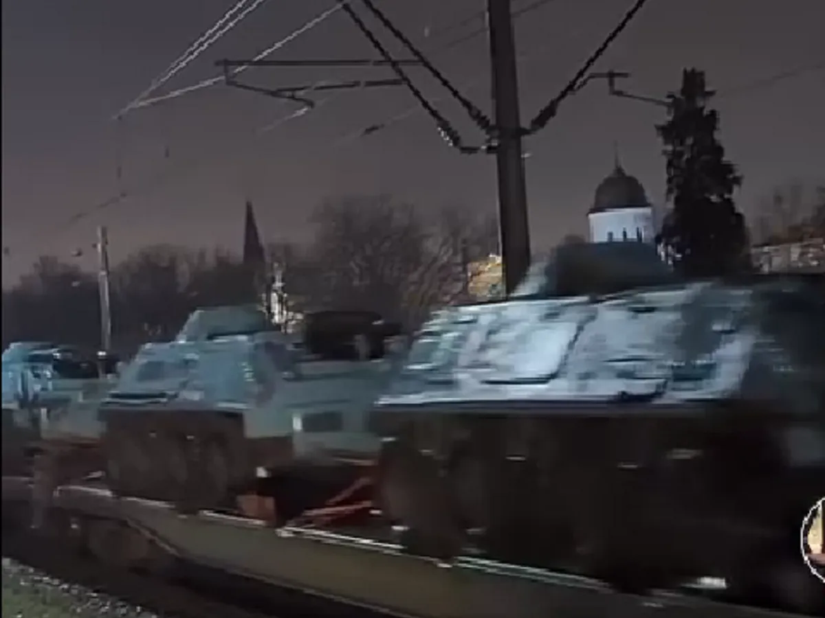 O înregistrare video devenită virală pe o rețea de socializare arată un tren de marfă care transportă zeci de transportoare blindate.