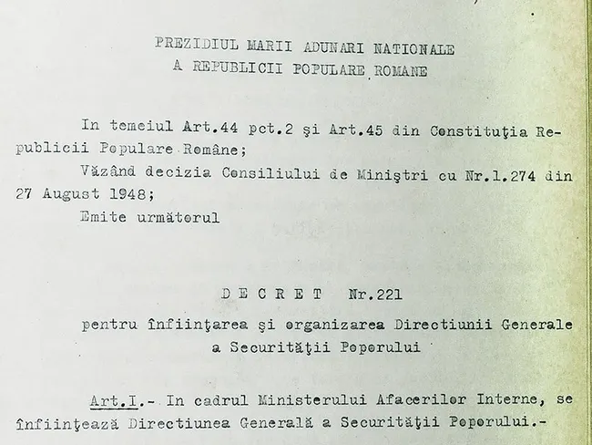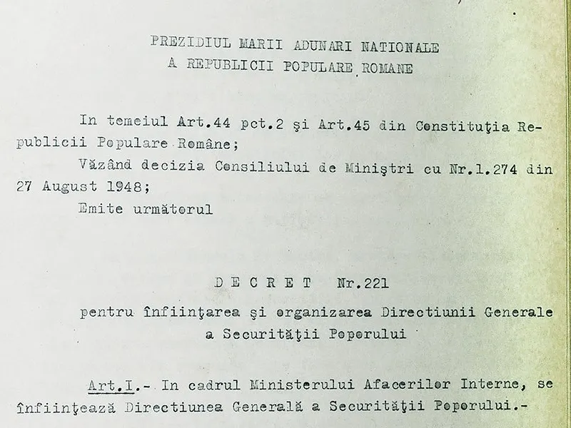 Rolul Securității era „apărarea cuceririlor democratice și asigurarea securității Republicii Populare Române contra uneltirilor dușmănoase din interior și exterior“, potrivit Decretului 221.