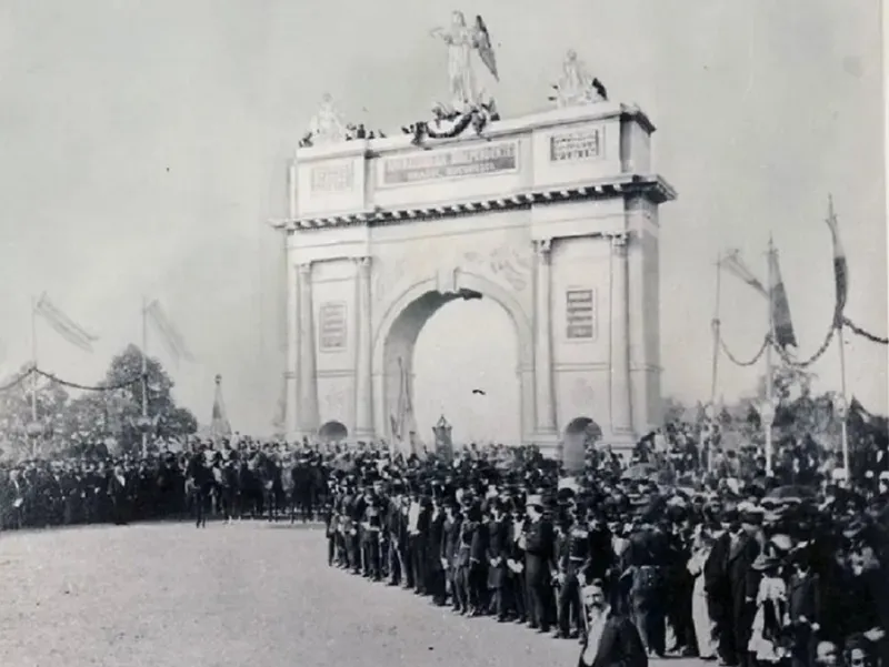 Defilarea soldaților români, din 1878, a fost prima care a avut loc pe sub varianta de atunci a Arcului de Triumf - Foto: arhiva