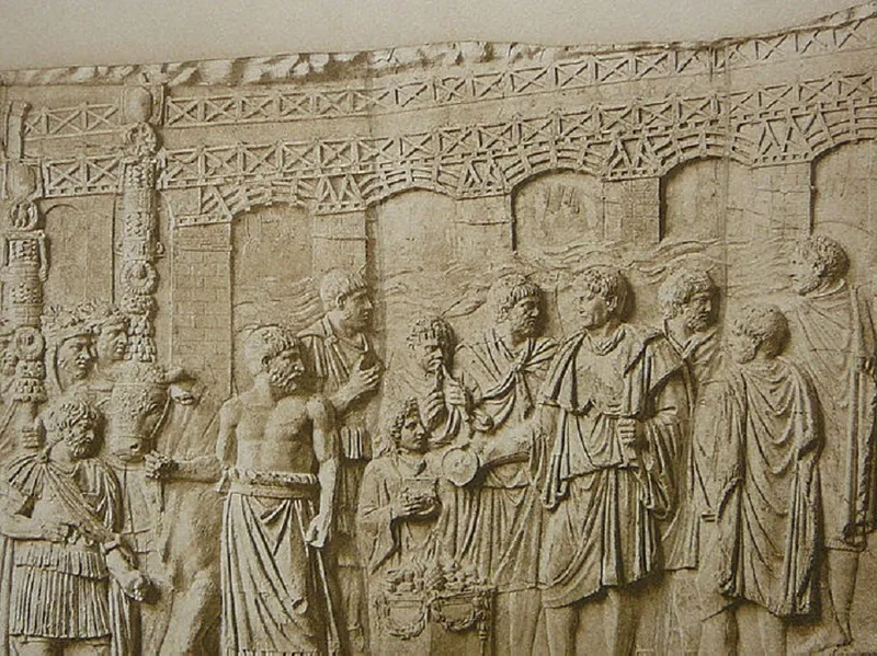 Podul construit de Apolodor din Damasc peste Dunăre, așa cum apare pe Columna lui Traian - Foto: arhiva