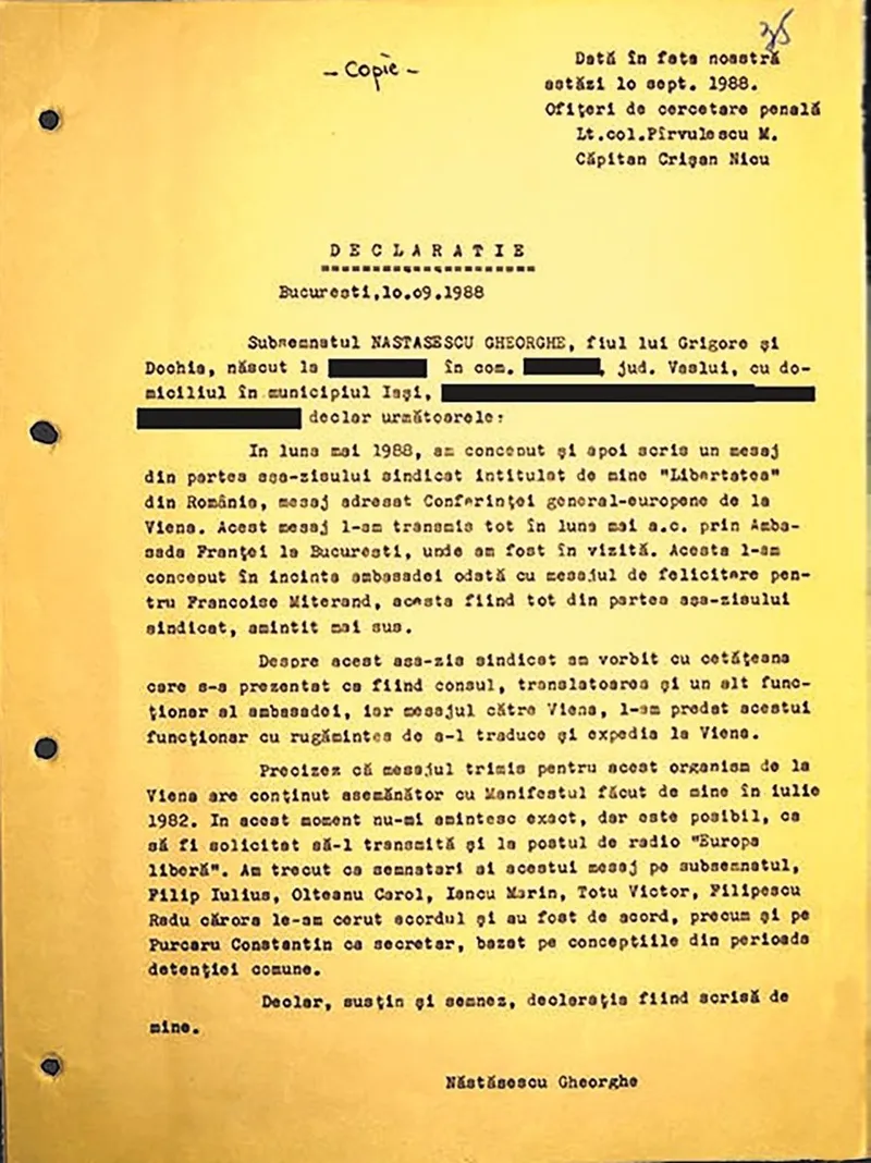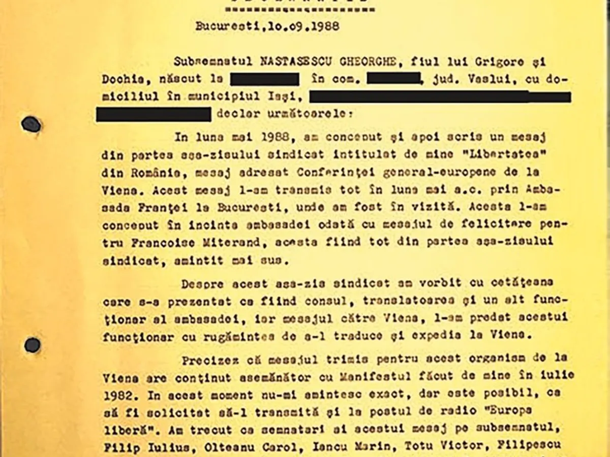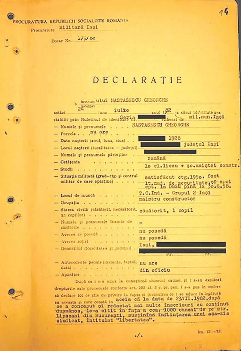 „La 23 iulie 1982 s-a deplasat în București, pe Strada Lipscani, unde, în prezența mai multor persoane, la un imobil în renovare, a citit materialul cu conținut dușmănos“, se arată în documentul anchetatorilor, păstrat în arhivele CSNAS.