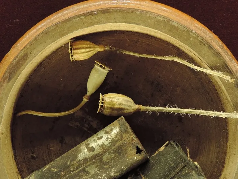 Capsule cu teriac și măciuluii de mac, din care se extrăgea opiul - Foto: farmacluj.blogspot.com