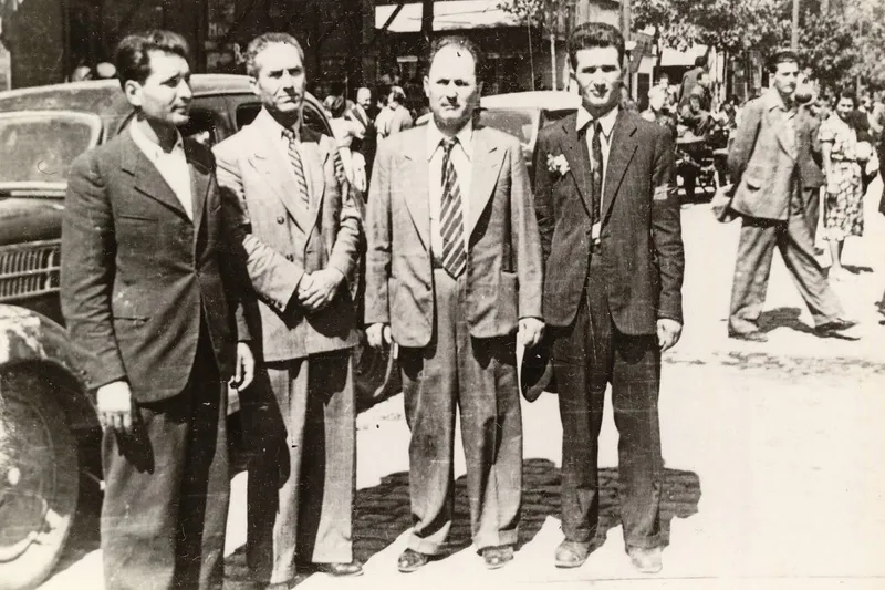 Gheorghe Apostol, primul din stânga, împreună cu Nicolae Ceaușescu, primul din dreapta, și alți comuniști, la întâmpinarea trupelor sovietice în București, la 31 august 1944 - Foto: Fototeca online a comunismului românesc - cota 19/1944