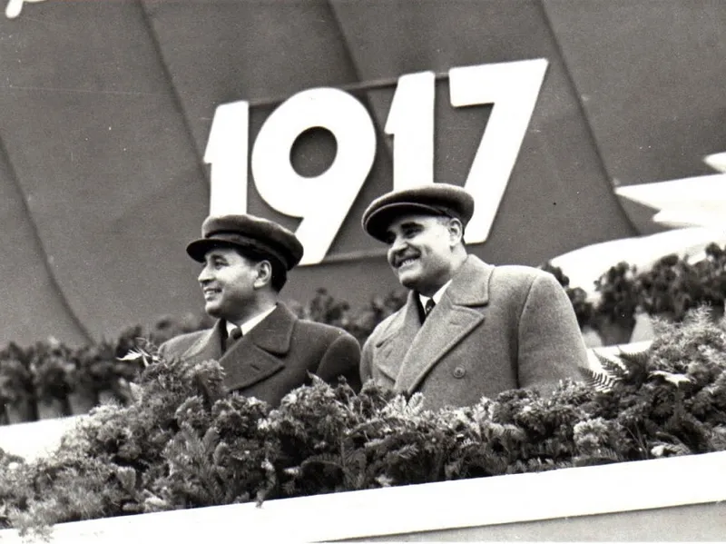 Gheorghe Apostol, cel din stânga, alături de Gheorghe Gheorghiu-Dej, la 7 noiembrie 1952, cu ocazia manifestațiilor care marcau 35 de ani de la Revoluția bolșevică din 1917 - Foto: Fototeca online a comunismului românesc - cota 197/1952