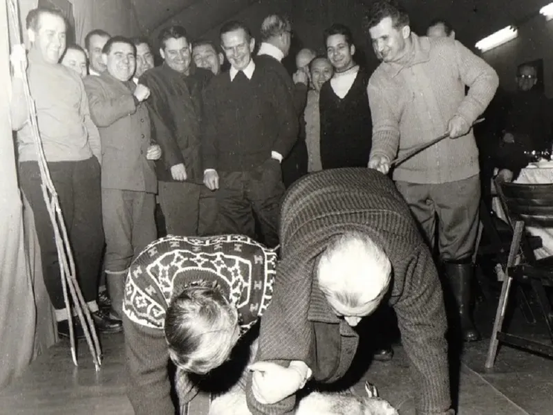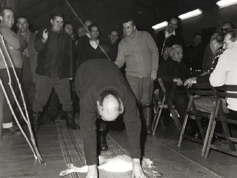 Ceaușescu, în ianuarie 1969, lovind la fund cu o nuia, cu vădită plăcere, un ambadador străin, în cadrul ritualului vânătoresc - Foto: Fototeca online a comunismului românesc