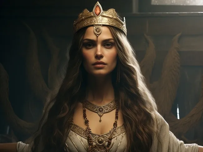 Femeia are înfăţişarea unei prinţese, ţine la sân un prunc şi priveşte spre un grup de femei dace, rămas puțin în urmă.