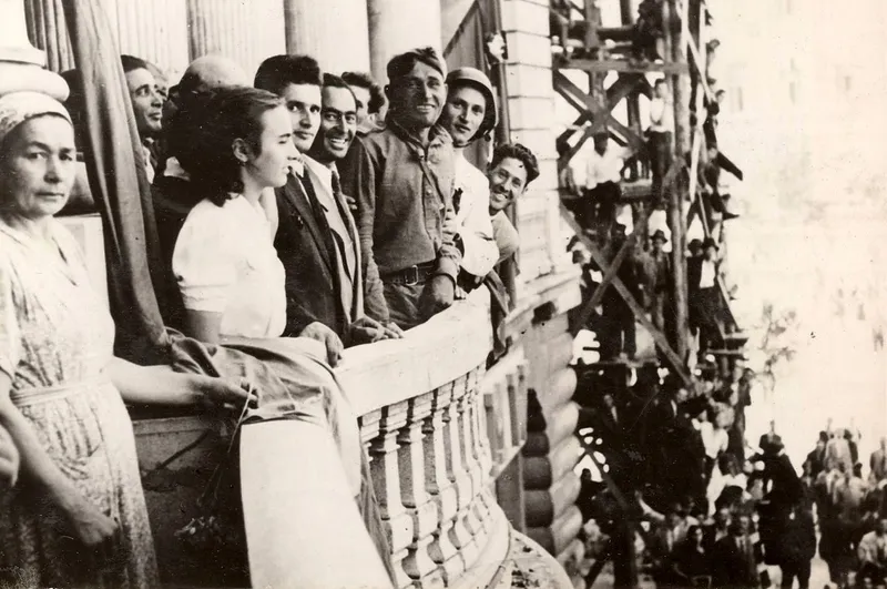 Nicolae și Elena Ceaușescu, în balconul Palatului „Generala” din Piața Universității, pe 30 august 1944, întâmpinând trupele sovietice care intraseră în București - Foto: Fototeca online a comunismului românesc - cota 2/1944