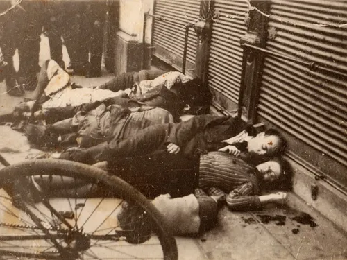 Una dintre cele mai cunoscute imagini asociate cu Pogromul de la Iași este cea a unui grup de oameni împușcați în fața unui local.