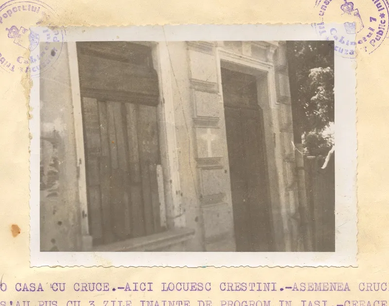 „La 24 iunie 1941, a avut loc un prim bombardament al aviației sovietice asupra Iașilor. Imediat s-a născut o puternică psihoză antisemită de masă. Cadrele armatei, legionarii și cuziștii au răspândit zvonul că întreaga populație evreiască a orașului Iași s-ar afla în slujba Armatei Roșii, semnalizând aviației sovietice locurile unde să-și arunce bombele. „În ziua de 25 iunie, polițiștii ieșeni au cutreierat casele, invitând populația creștină să-și pună la ferestre și la intrare semnul crucii”. Declarațiile inspectorului de poliție Gheorghe Leahu și ale colonelului Constantin Lupu, șef al garnizoanei Iași, confirmă această mărturie, precum și o fotografie aflată astăzi în arhiva SRI”, se mai arată în lucrarea citată.