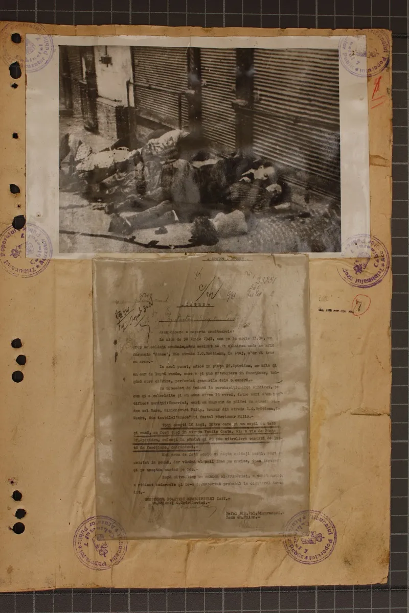 „Stând în fața legiunii, pe strada Carol, văd vreo câteva sute de evrei (3-400) cu mâinile în sus, unii răniți și plini de sânge, unul cu ochiul scos, așezați în rânduri de trei sau patru. Evreii gemeau sau plângeau și dacă vreunul ar fi încercat să lase brațul în jos, era împuns sau bătut cu patul armei”, conform mărturiei căpitanului Richard Filipescu, din Armata Română.