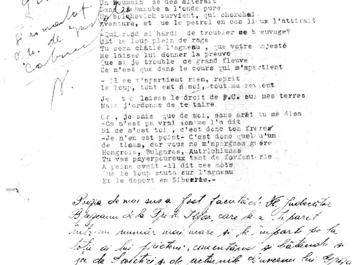 (Cel mai tare are întotdeauna dreptate/O vom demonstra imediat/Un român bea apă/Din unda pură a Dunării/Un bolșevic aventurier apăru dintr-o dată/Atras de petrol în acele locuri/Abia a rostit aceste cuvinte/Că lupul a sărit asupra mielului/Și l-a deportat în Siberia).