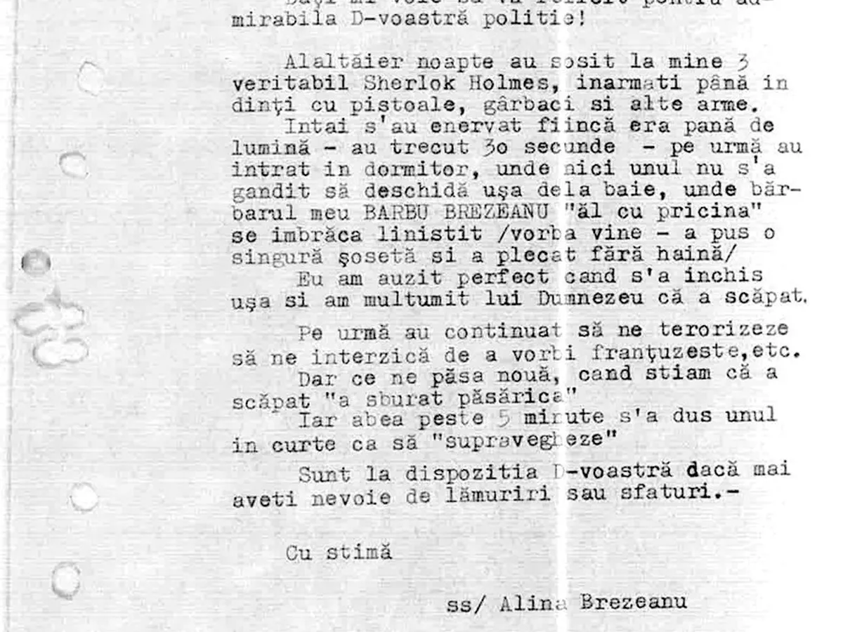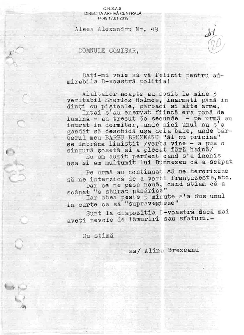 Alina Brezianu îi scrie comisarului o epistolă (facsimil dreapta) într-un ton ironic, în care îi ia peste picior pe polițiștii care dăduseră buzna în casă, cu ordinul de a-l ridica pe soțul ei.
