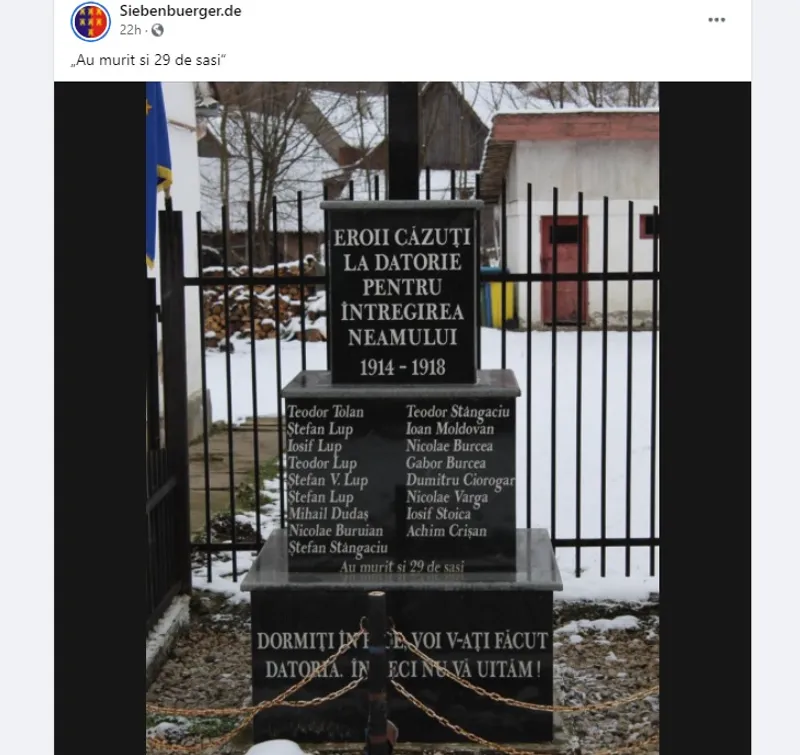 O imagine cu monumentul a fost postată pe Facebook luni, de Siebenburger.de și arată că pe monumentul închinat eroilor căzuți la datorie în Primul Război Mondial apar numele a 17 români, sub care este trecut „Au murit și 29 de sași”.