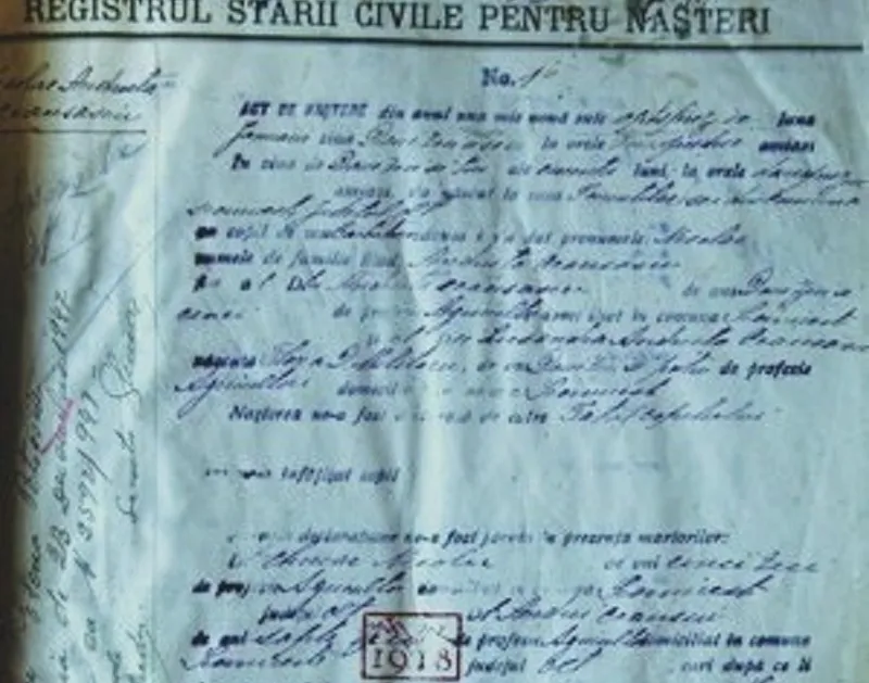 Actul oficial menționează atât numele primarului cât și al notarului comunei Scornicești și poartă denumirea de „Act de naștere din anul una mie nouă sute optsprezece, luna Ianuarie, ziua două zeci şi șase, la orele douăsprezece amiazi”.