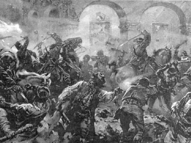 Bravul escadron, compus numai din 60 de soldați, a străbătut din mijlocul acelei mulțimi compuse din câteva mii de oameni înarmați cu puști, cu diferite unelte de fier și cu picioare de scaune, cu care loveau în noi și în cai.