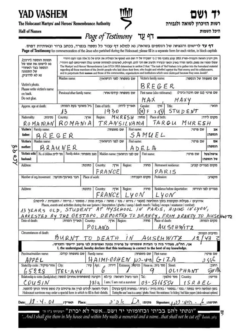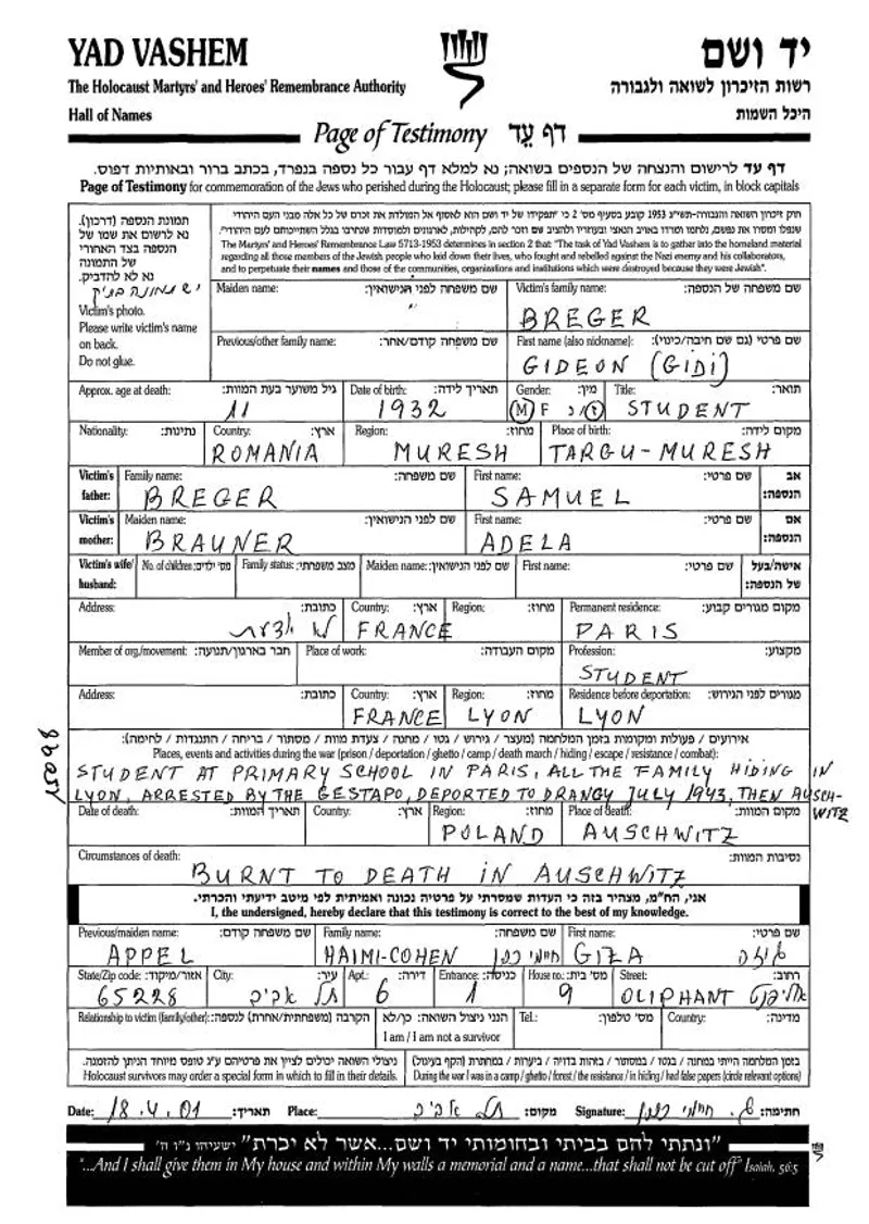 (...) În jurul zilei de 12 decembrie 1943 au fost cu toții transportați la lagărul din Drancy, ia de aci deportați fără să se știe unde, deportarea având loc în 17 sau 18 decembrie 1943.