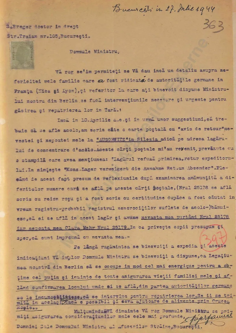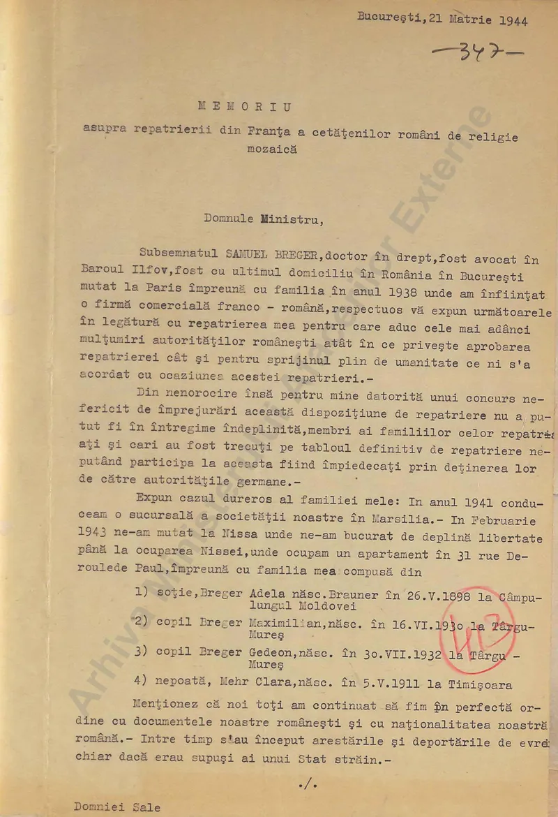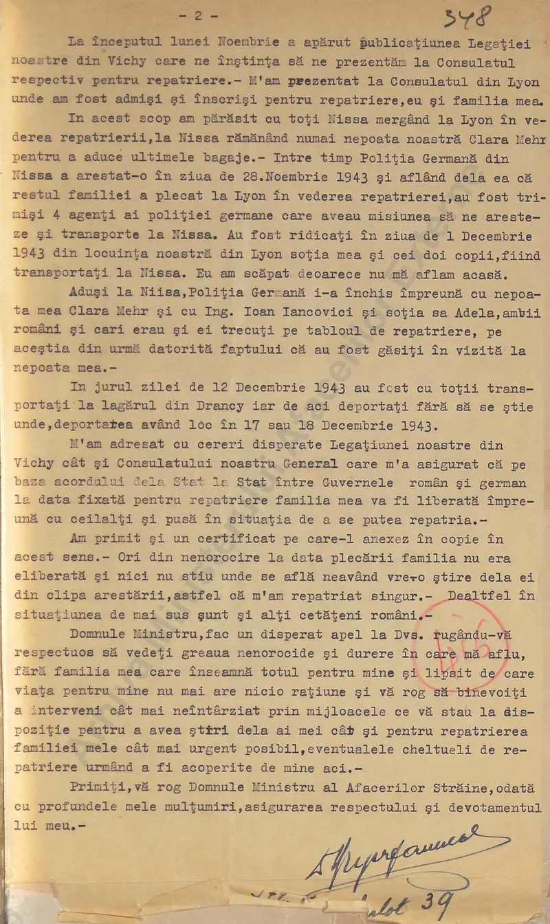 M-am adresat cu cereri disperate Legațiunea noastre din Vichy, cât și Consulatului nostru General care m-a asigurat că pe baza acordului de la stat la stat între guvernele român și german la data fixată pentru repatriere familia mea va fi liberată împreună cu ceilalți și pusă în situația de a se putea repatria. Am primit și un certificat pe care-l anexez în copie în acest sens. Ori din nenorocire la data plecării familia mea nu era eliberată și nici nu știu unde se află, neavând vreo știre de la ei din clipa arestării, astfel că m-am repatriat singur. (...)