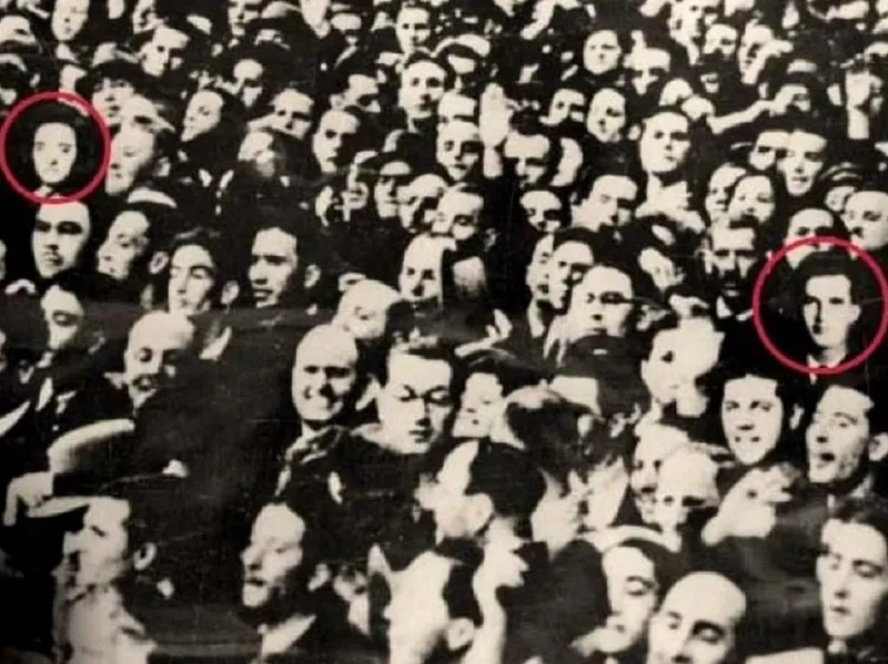 Fotografia trucată în care capetele lui Nicolae și Elena Ceaușescu (înconjurate cu roșu) apar în mulțimea participanților la evenimentul din 1 mai 1939 din București - Foto: arhiva